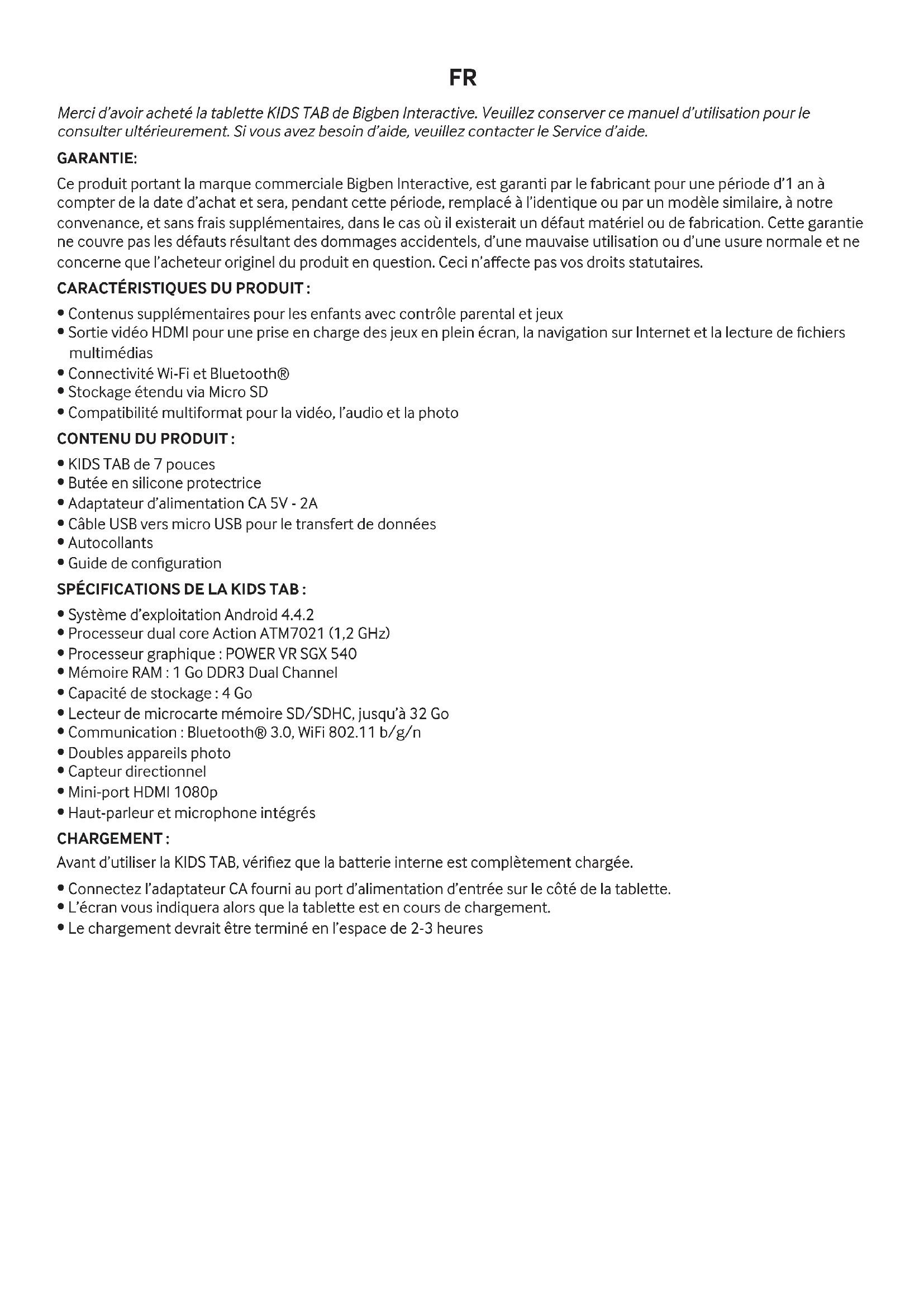 Merci d'avoir acheté la tablette KIDS TAB de Bigben Interactive. Veuillez conserver ce manuel d'utilisation pour le consulter ultérieurement. Si vous avez besoin d'aide, veuillez contacter le Service d'aide.