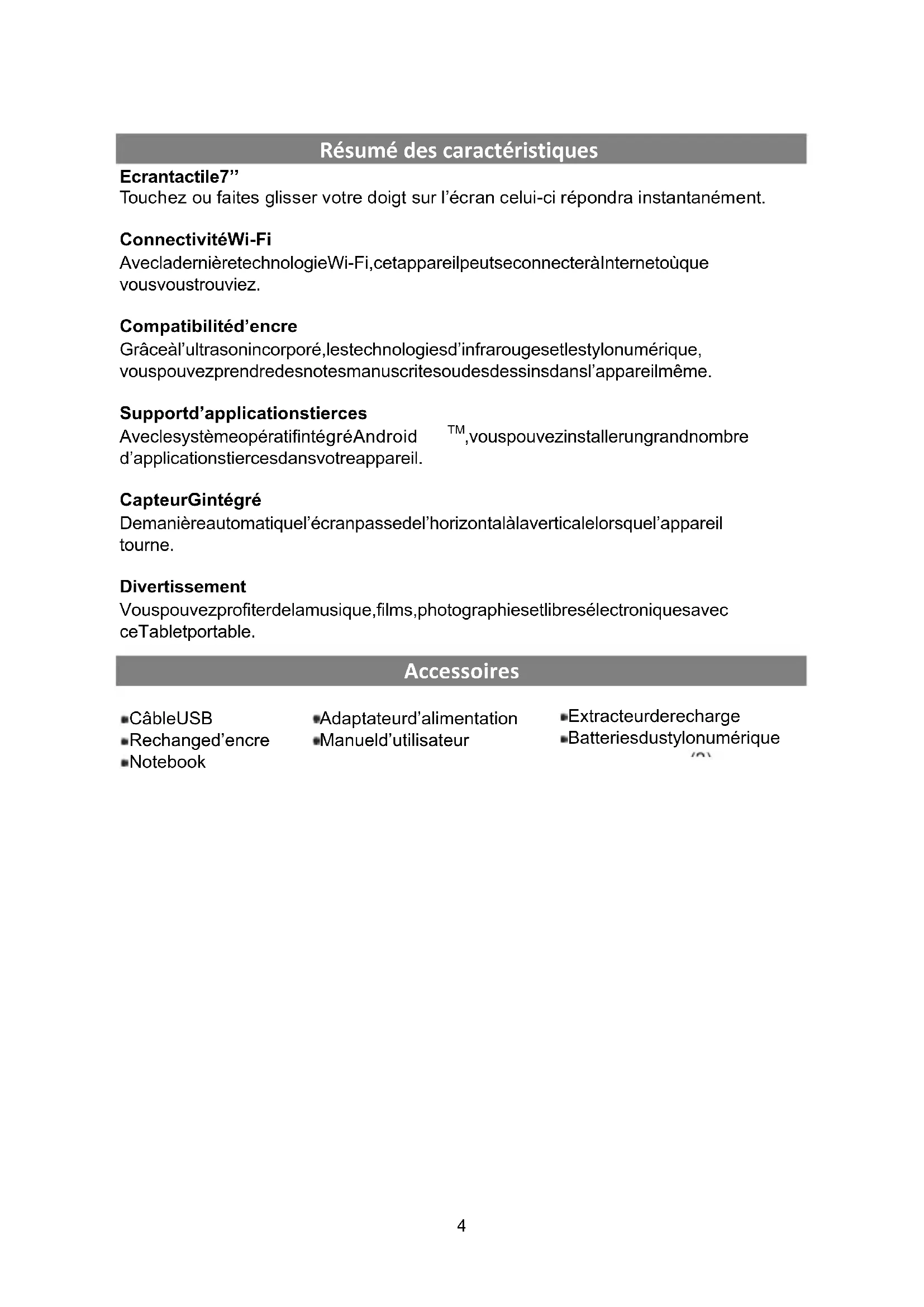 SPECIFICATIONS ............ .....................................................................................354 Résumé des caractéristiques Ecran tactil e 7’’ Touchez ou faites gli sser votre doigt sur l’écran celui-ci répondra instantanément. Connectivité Wi-Fi Avec la dernière technologie Wi-Fi, cet appareil peut se connecter à Internet où que vous vous trouviez. Compatibilité d’encre Gr âce à l’ultrason incorporé, les technologies d’infrarouges et le stylo numérique, vous pouvez prendre des notes manuscrites ou des dess ins dans l’appareil même. Support d’applications tierces Avec le système opératif int égré Android