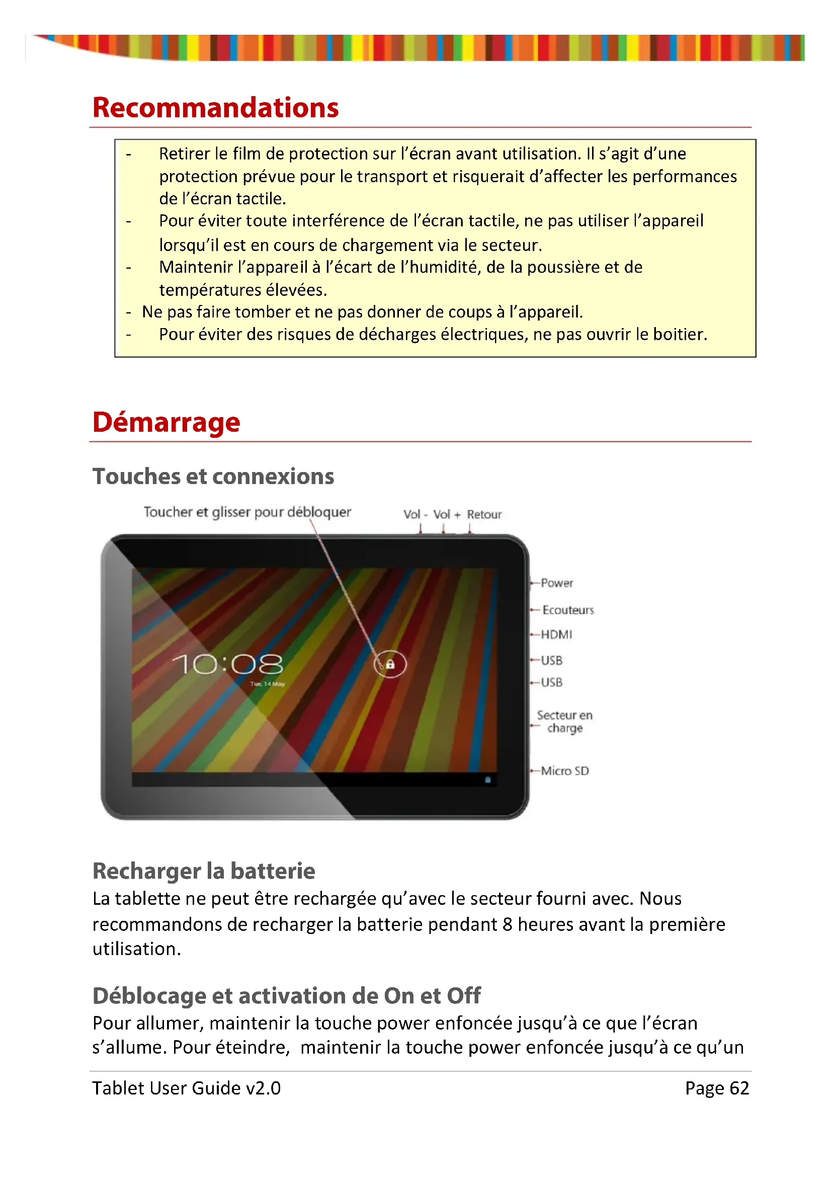 - Obtenir plus d’informations Tablet User Guide v2.0 Page 61Recommandations - Retirer le film de protection sur l’écran avant utilisation. Il s’agit d’une protection prévue pour le transport et risquerait d’affecter les performances de l’écran tactile. - Pour éviter toute interférence de l’écran tactile, ne pas utiliser l’appareil lorsqu’il est en cours de chargement via le secteur. - Maintenir l’appareil à l’écart de l’humidité, de la poussière et de températures élevées. - Ne pas faire tomber et ne pas donner de coups à l’appareil. - Pour éviter des risques de décharges électriques, ne pas ouvrir le boitier. Démarrage Touches et connexions Recharger la batterie La tablette ne peut être rechargée qu’avec le secteur fourni avec. Nous recommandons de recharger la batterie pendant 8 heures avant la première utilisation. Déblocage et activation de On et Off Pour allumer, maintenir la touche power enfoncée jusqu’à ce que l’écran s’allume. Pour éteindre, maintenir la touche power enfoncée jusqu’à ce qu’un Tablet User Guide v2.0 Page 62menu apparaisse et demande ce que vous voulez faire. Pour mettre la tablette en veille ou au contraire sortir de veille appuyer une seule fois sur le bouton power. Débloquer l’écran Vous devez débloquer l’écran avant utilisation de la tablette. Pour cela, placer un doigt sur l’icône de verrou et glisser vers l’autre côté de l’écran. Bloquer l’écran La tablette se bloque automatiquement par défaut après 1 minute d’inutilisation. Pour bloquer manuellement l’écran, appuyer sur la touche power. L’écran devient vierge et l’appareil est bloqué. Utilisation de l’écran tactile L’écran tactile capacitif offre un toucher fluide et réactif sans nécessité d’exercer une pression sur l’écran. p. 78