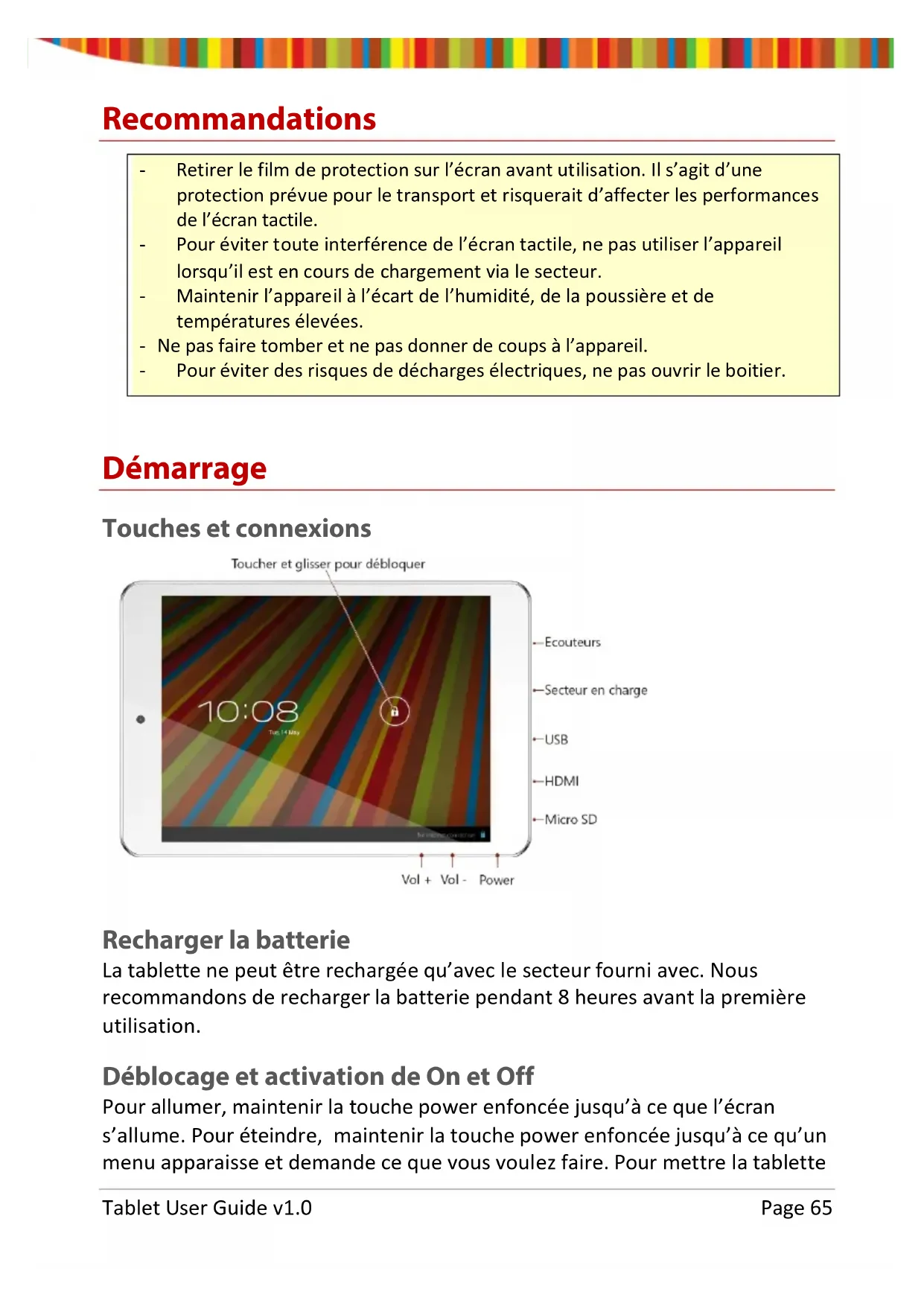 - Obtenir plus d’informations Tablet User Guide v1.0 Page 64Recommandations - Retirer le film de protection sur l’écran avant utilisation. Il s’agit d’une protection prévue pour le transport et risquerait d’affecter les performances de l’écran tactile. - Pour éviter toute interférence de l’écran tactile, ne pas utiliser l’appareil lorsqu’il est en cours de chargement via le secteur. - Maintenir l’appareil à l’écart de l’humidité, de la poussière et de températures élevées. - Ne pas faire tomber et ne pas donner de coups à l’appareil. - Pour éviter des risques de décharges électriques, ne pas ouvrir le boitier. Démarrage Touches et connexions Recharger la batterie La tablette ne peut être rechargée qu’avec le secteur fourni avec. Nous recommandons de recharger la batterie pendant 8 heures avant la première utilisation. Déblocage et activation de On et Off Pour allumer, maintenir la touche power enfoncée jusqu’à ce que l’écran s’allume. Pour éteindre, maintenir la touche power enfoncée jusqu’à ce qu’un menu apparaisse et demande ce que vous voulez faire. Pour mettre la tablette Tablet User Guide v1.0 Page 65en veille ou au contraire sortir de veille appuyer une seule fois sur le bouton power. Débloquer l’écran Vous devez débloquer l’écran avant utilisation de la tablette. Pour cela, placer un doigt sur l’icône de verrou et glisser vers l’autre côté de l’écran. Bloquer l’écran La tablette se bloque automatiquement par défaut après 1 minute d’inutilisation. Pour bloquer manuellement l’écran, appuyer sur la touche power. L’écran devient vierge et l’appareil est bloqué. Utilisation de l’écran tactile L’écran tactile capacitif offre un toucher fluide et réactif sans nécessité d’exercer une pression sur l’écran. p. 84
