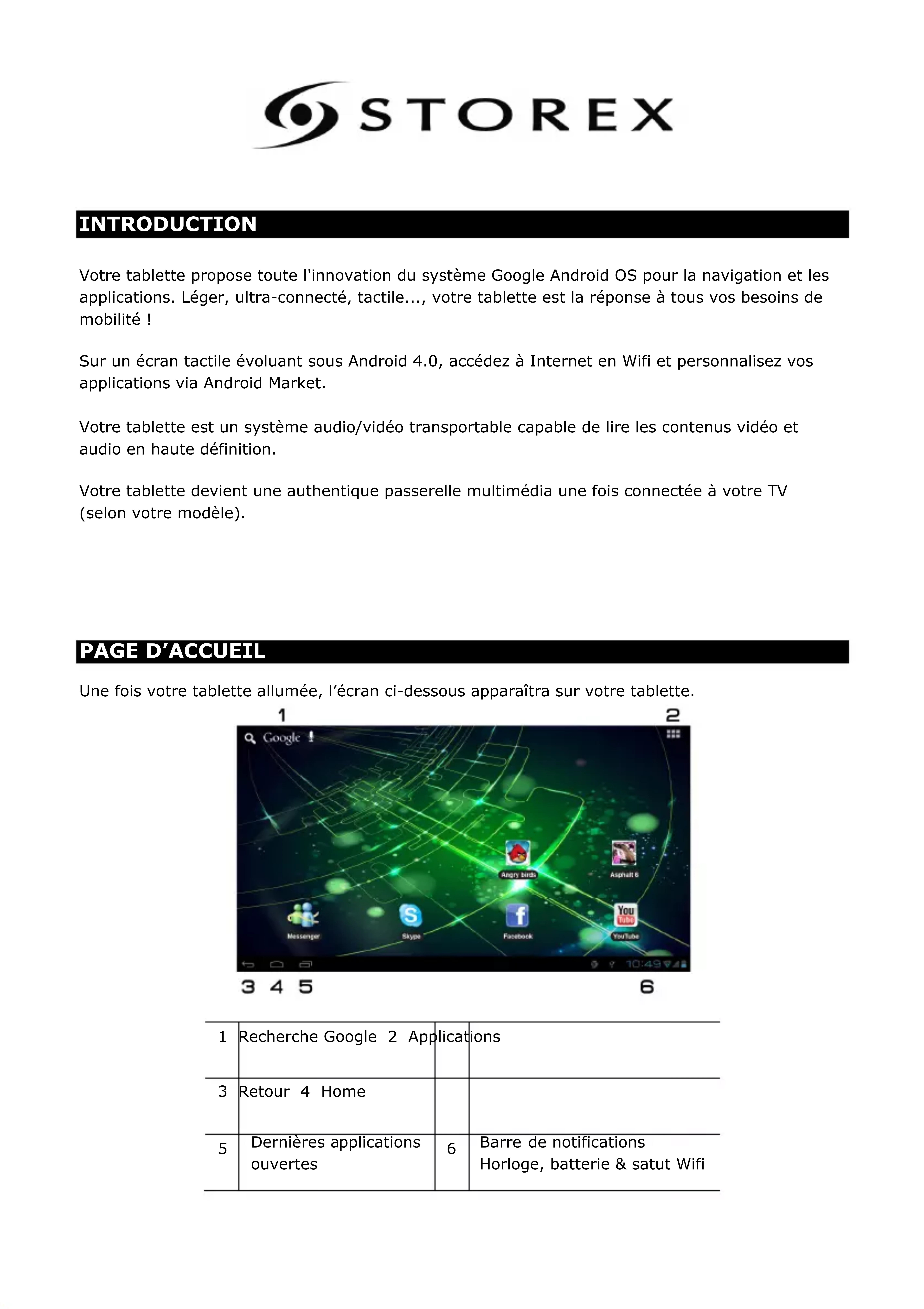 INTRODUCTION Votre tablette propose toute l'innovation du système Google Android OS pour la navigation et les applications. Léger, ultra-connecté, tactile..., votre tablette est la réponse à tous vos besoins de mobilité ! Sur un écran tactile évoluant sous Android 4.0, accédez à Internet en Wifi et personnalisez vos applications via Android Market. Votre tablette est un système audio/vidéo transportable capable de lire les contenus vidéo et audio en haute définition. Votre tablette devient une authentique passerelle multimédia une fois connectée à votre TV (selon votre modèle).