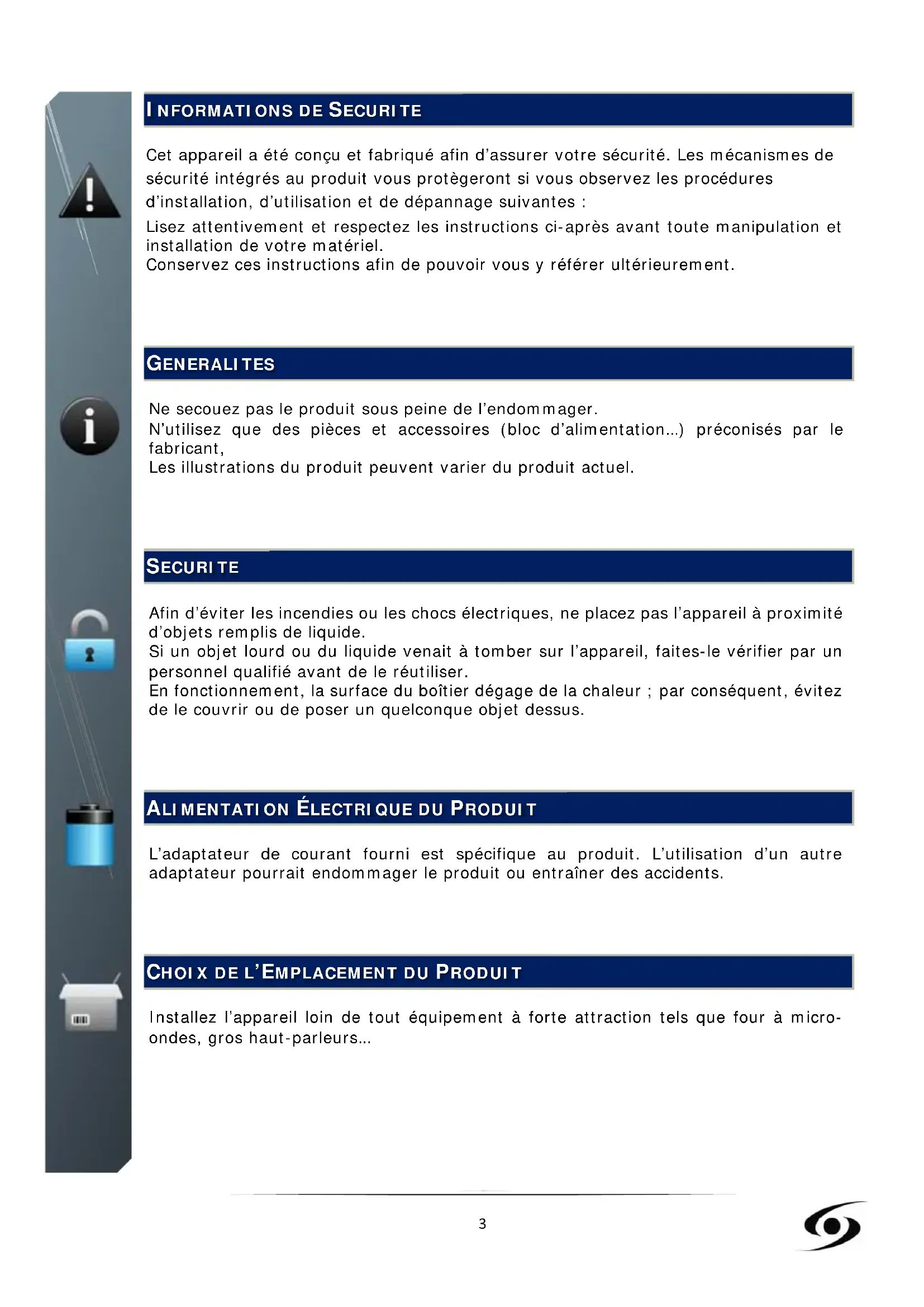 GENERALITES Ne secouez pas le produit sous peine de l’endommager. N’utilisez que des pièces et accessoires (bloc d’alimentation…) préconisés par le fabricant, Les illustrations du produit peuvent varier du produit actuel.