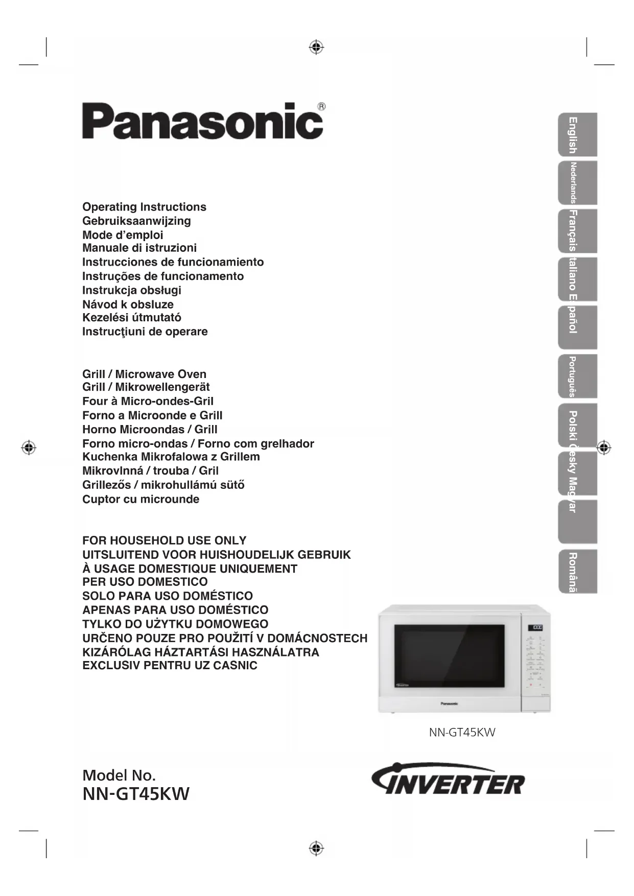 - NN-GT45KW English Nederlands Français Italiano Español Português Polski Česky Magyar RomânãIMPORTANT SAFETY INSTRUCTIONS. Before operating this oven, please read these instructions carefully and keep for future reference. BELANGRIJKE VEILIGHEIDSINSTRUCTIES. Alvorens u deze microgolfoven gebruikt, raden wij u ten zeerste aan deze gebruiksaanwijzing door te lezen en bij te houden voor eventueel toekomstig gebruik. INSTRUCTIONS DE SÛRETÉ IMPORTANTES. Avant d’utiliser le four à micro- ondes, lisez attentivement les recommandations d’utilisation et conservez-les soigneusement. ISTRUZIONI IMPORTANTI PER LA SICUREZZA. Prima di utilizzare il forno, leg- gere con attenzione questo manuale e conservarlo per future consultazioni. INSTRUCCIONES SOBRE SEGURIDAD IMPORTANTES. Antes de comenzar a utilizar su horno microondas, lea cuidadosamente las siguientes instrucciones y guardelas para futuras cuestiones. IMPORTANTES INSTRUÇÕES DE SEGURANÇA. Antes de utilizar este forno, leia atentamente as instruções e guarde-as para consulta futura. WAŻNE INSTRUKCJE BEZPIECZEŃSTWA. Przed włączeniem kuchenki prosimy o dokładne przeczytanie instrukcji obsługi i o zachowanie jej na przyszłość. DŮLEŽITÉ POKYNY K BEZPEČNOSTI. Pečlivě si je prosím přečtěte a uložte pro pozdější použití. INSTRUCŢIUNI DE SIGURANŢĂ IMPORTANTE: Înainte de utilizarea a aces- tui cuptor, vă rugăm să citiţi cu atenţie aceste instrucţiuni şi să le păstraţi pentru referinţe ulterioare. INSTRUCŢIUNI DE SIGURANŢĂ IMPORTANTE: Înainte de utilizarea a aces- tui cuptor, vă rugăm să citiţi cu atenţie aceste instrucţiuni şi să le păstraţi pentru referinţe ulterioare.1 FR Français Merci d’avoir fait l’achat d’un four micro-ondes Panasonic Sommaire Consignes de Sécurité p. 2