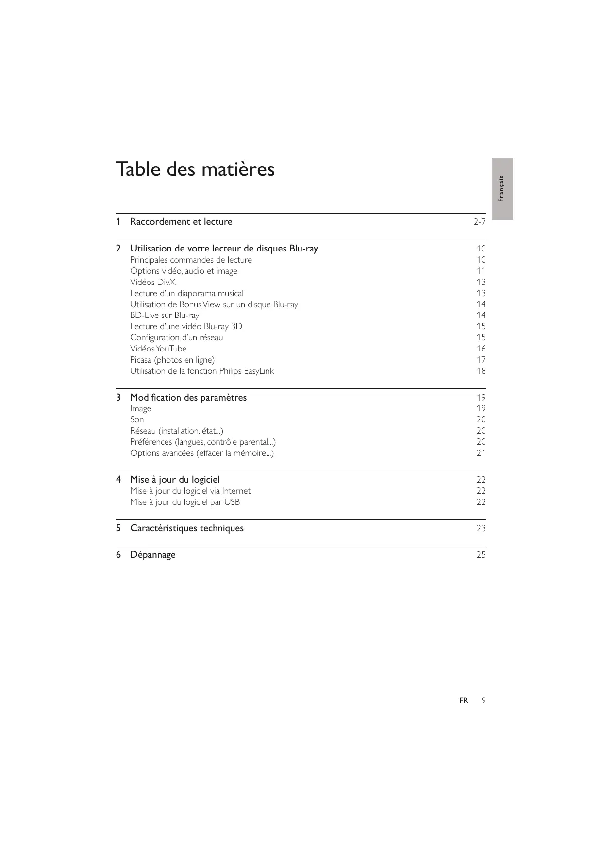 Principales commandes de lecture Options vidéo, audio et image Vidéos DivX Lecture d’un diaporama musical Utilisation de Bonus View sur un disque Blu-ray BD-Live sur Blu-ray Lecture d’une vidéo Blu-ray 3D Configuration d’un réseau Vidéos YouTube Picasa (photos en ligne) Utilisation de la fonction Philips EasyLink