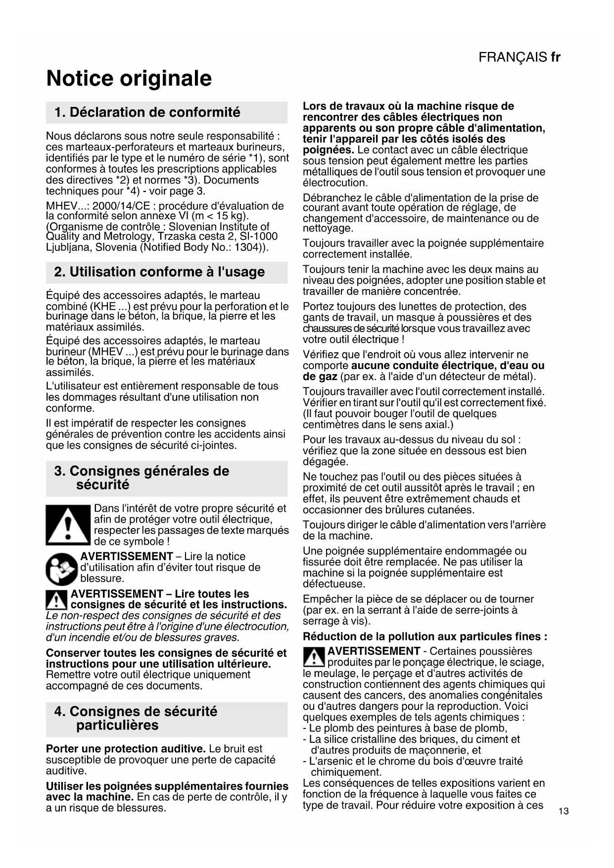 Notice originale Nous déclarons sous notre seule responsabilité : ces marteaux-perforateurs et marteaux burineurs, identifiés par le type et le numéro de série *1), sont conformes à toutes les prescriptions applicables des directives *2) et normes *3). Documents techniques pour *4) - voir page 3. MHEV...: 2000/14/CE : procédure d'évaluation de la conformité selon annexe VI (m < 15 kg). (Organisme de contrôle : Slovenian Institute of Quality and Metrology, Trzaska cesta 2, SI-1000 Ljubljana, Slovenia (Notified Body No.: 1304)). Équipé des accessoires adaptés, le marteau combiné (KHE ...) est prévu pour la perforation et le burinage dans le béton, la brique, la pierre et les matériaux assimilés. Équipé des accessoires adaptés, le marteau burineur (MHEV ...) est prévu pour le burinage dans le béton, la brique, la pierre et les matériaux assimilés. L'utilisateur est entièrement responsable de tous les dommages résultant d'une utilisation non conforme. Il est impératif de respecter les consignes générales de prévention contre les accidents ainsi que les consignes de sécurité ci-jointes. Dans l'intérêt de votre propre sécurité et afin de protéger votre outil électrique, respecter les passages de texte marqués de ce symbole ! AVERTISSEMENT – Lire la notice d’utilisation afin d’éviter tout risque de blessure. AVERTISSEMENT – Lire toutes les consignes de sécurité et les instructions. Le non-respect des consignes de sécurité et des instructions peut être à l'origine d'une électrocution, d'un incendie et/ou de blessures graves. Conserver toutes les consignes de sécurité et instructions pour une utilisation ultérieure. Remettre votre outil électrique uniquement accompagné de ces documents. Porter une protection auditive. Le bruit est susceptible de provoquer une perte de capacité auditive. Utiliser les poignées supplémentaires fournies avec la machine. En cas de perte de contrôle, il y a un risque de blessures. Lors de travaux où la machine risque de rencontrer des câbles électriques non apparents ou son propre câble d'alimentation, tenir l'appareil par les côtés isolés des poignées. Le contact avec un câble électrique sous tension peut également mettre les parties métalliques de l'outil sous tension et provoquer une électrocution. Débranchez le câble d'alimentation de la prise de courant avant toute opération de réglage, de changement d'accessoire, de maintenance ou de nettoyage. Toujours travailler avec la poignée supplémentaire correctement installée. Toujours tenir la machine avec les deux mains au niveau des poignées, adopter une position stable et travailler de manière concentrée. Portez toujours des lunettes de protection, des gants de travail, un masque à poussières et des chaussures de sécurité lorsque vous travaillez avec votre outil électrique ! Vérifiez que l'endroit où vous allez intervenir ne comporte aucune conduite électrique, d'eau ou de gaz (par ex. à l'aide d'un détecteur de métal). Toujours travailler avec l'outil correctement installé. Vérifier en tirant sur l'outil qu'il est correctement fixé. (Il faut pouvoir bouger l'outil de quelques centimètres dans le sens axial.) Pour les travaux au-dessus du niveau du sol : vérifiez que la zone située en dessous est bien dégagée. Ne touchez pas l'outil ou des pièces situées à proximité de cet outil aussitôt après le travail ; en effet, ils peuvent être extrêmement chauds et occasionner des brûlures cutanées. Toujours diriger le câble d'alimentation vers l'arrière de la machine. Une poignée supplémentaire endommagée ou fissurée doit être remplacée. Ne pas utiliser la machine si la poignée supplémentaire est défectueuse. Empêcher la pièce de se déplacer ou de tourner (par ex. en la serrant à l'aide de serre-joints à serrage à vis). Réduction de la pollution aux particules fines : AVERTISSEMENT - Certaines poussières produites par le ponçage électrique, le sciage, le meulage, le perçage et d'autres activités de construction contiennent des agents chimiques qui causent des cancers, des anomalies congénitales ou d'autres dangers pour la reproduction. Voici quelques exemples de tels agents chimiques : - Le plomb des peintures à base de plomb, - La silice cristalline des briques, du ciment et d'autres produits de maçonnerie, et - L'arsenic et le chrome du bois d'œuvre traité chimiquement. Les conséquences de telles expositions varient en fonction de la fréquence à laquelle vous faites ce type de travail. Pour réduire votre exposition à ces