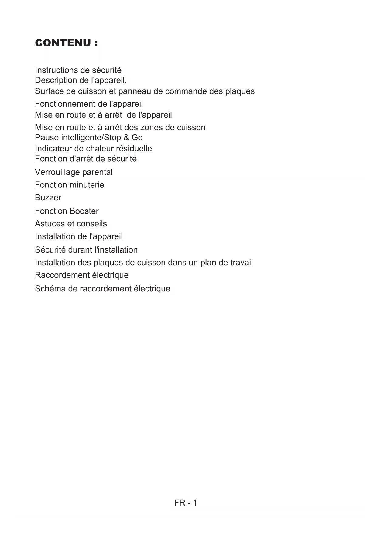 EHVOXLWHQHQYRRUVFKULIWHQLQGHQRUPHQ ZDDUQDDUZRUGWYHUZH]HQGB: The symbol on the product or on its packaging indicates that this product may not be treated as household waste. Instead it shall be handed over the applicable collection point for recycling of electrical and electronic equip-ment. By ensuring this product is disposed of correctly, you will help prevent potential nega-tive consequences for the environment and hu-man health, which could otherwise be caused by inappropriate waste handling of this product. For more detailed information about recycling this product, please contact your local city of- ices, your household waste disposal service or the shop where you purchased the product. FR: Ce symbole sur le produit ou sur l’emballage indique que ce produit ne doit pas être traité comme des déchets ménagers. Il doit plutôt être remis au point de ramassage concerné, se chargeant du recyclage du maté-riel électrique et électronique. En vous confor-mant à une procédure d’enlèvement correcte du produit, vous aiderez à prévenir tout effet nuisible à l’environnement et à la santé, qu’une manipulation inappropriée pourrait autrement provoquer. Pour plus de détails concernant le recyclage de ce produit, veuillez contacter votre autorité locale, un centre de recyclage des déchets domestiques ou la boutique où vous avez acheté le produit. NL: Het symbool op het product of de verpak-king geeft aan dat dit product niet mag worden behandeld als huishoudelijk afval. In plaats daarvan dient het te worden ingeleverd bij het van toepassing zijnde inzamelpunt voor de recycling van elektrische en elektronische ap-paratuur. Door dit product correct te verwijde-ren voorkomt u mogelijke negatieve gevolgen voor het milieu en de menselijke gezondheid, die anders zouden kunnen worden veroorzaakt door een onjuiste afvalverwerking van dit product. Meer gedetailleerde informatie over de recycling van dit product kunt u opvragen bij uw gemeente, de afvalverwijderingsdienst ofFR - 1 CONTENU : Instructions de sécurité Description de l'appareil. Surface de cuisson et panneau de commande des plaques Fonctionnement de l'appareil Mise en route et à arrêt de l'appareil Mise en route et à arrêt des zones de cuisson Pause intelligente/Stop & Go Indicateur de chaleur résiduelle Fonction d'arrêt de sécurité Verrouillage parental Fonction minuterie Buzzer Fonction Booster Astuces et conseils Installation de l'appareil Sécurité durant l'installation Installation des plaques de cuisson dans un plan de travail Raccordement électrique Schéma de raccordement électriqueFR - 2