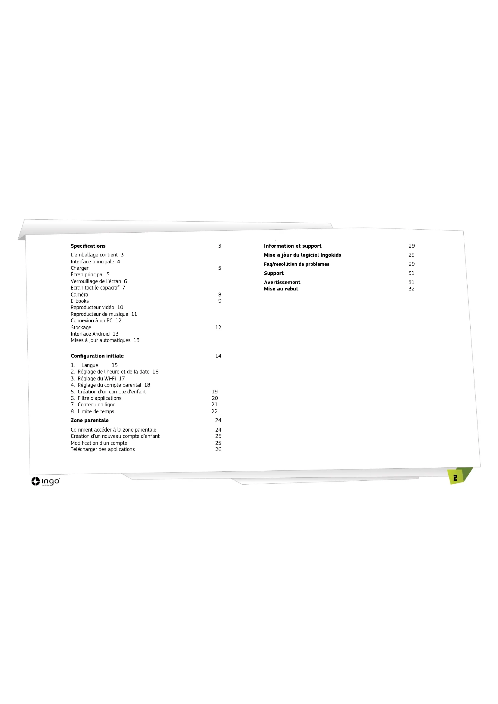 Zone parentale 24 Comment accéder à la zone parentale 24 Création d’un nouveau compte d’enfant 25 Modication d’un compte 25 Télécharger des applications 26 Information et support 29 Mise a jòur du logiciel Ingokids 29 Faq/resolútion de problemes 29 Support 31 Avertissement 31 Mise au rebut 323 Spécications Tablette Chargeur Câble microUSB Casques Boîtier