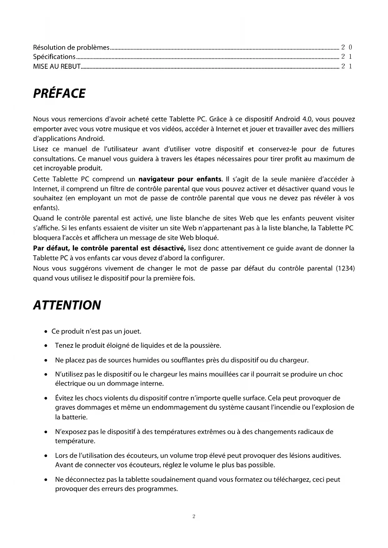Résolution de problèmes ............................................................................................................................................................ 20 Spécifications ................................................................................................................................................................................... 21 MISE AU REBUT ................................................................................................................................................................................ 21 PRÉFACE Nous vous remercions d’avoir acheté cette Tablette PC. Grâce à ce dispositif Android 4.0, vous pouvez emporter avec vous votre musique et vos vidéos, accéder à Internet et jouer et travailler avec des milliers d’applications Android. Lisez ce manuel de l’utilisateur avant d’utiliser votre dispositif et conservez-le pour de futures consultations. Ce manuel vous guidera à travers les étapes nécessaires pour tirer profit au maximum de cet incroyable produit. Cette Tablette PC comprend un navigateur pour enfants. Il s’agit de la seule manière d’accéder à Internet, il comprend un filtre de contrôle parental que vous pouvez activer et désactiver quand vous le souhaitez (en employant un mot de passe de contrôle parental que vous ne devez pas révéler à vos enfants). Quand le contrôle parental est activé, une liste blanche de sites Web que les enfants peuvent visiter s’affiche. Si les enfants essaient de visiter un site Web n’appartenant pas à la liste blanche, la Tablette PC bloquera l’accès et affichera un message de site Web bloqué. Par défaut, le contrôle parental est désactivé, lisez donc attentivement ce guide avant de donner la Tablette PC à vos enfants car vous devez d’abord la configurer. Nous vous suggérons vivement de changer le mot de passe par défaut du contrôle parental (1234) quand vous utilisez le dispositif pour la première fois. ATTENTION