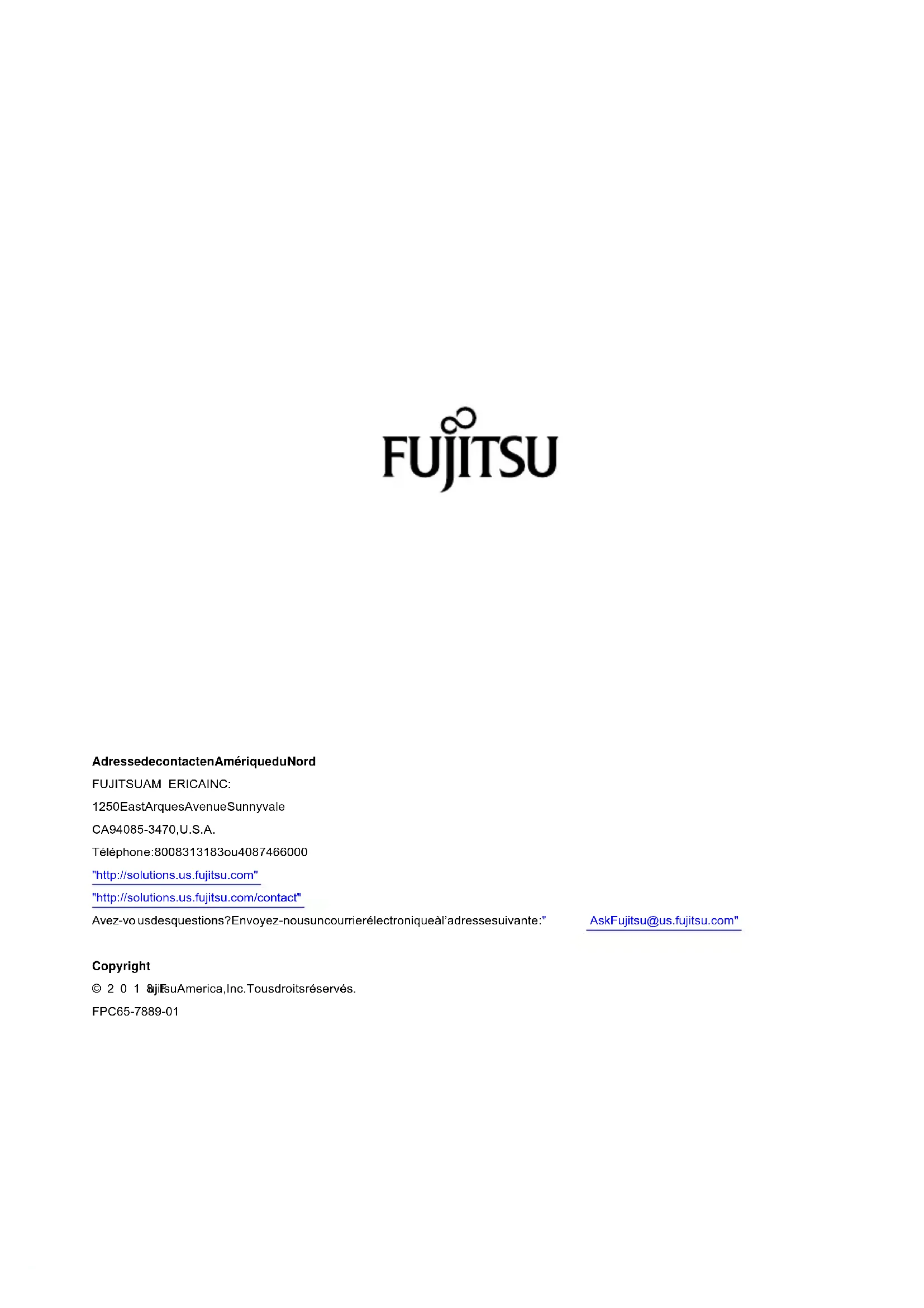 FujitsuAmerica, Incorporatedafaittoutsonpossiblepourveilleràl'exactitudeetàl'exhaustivité decedocument. Néanmoins, danslamesureoûdeseffortsconstantsdedéveloppement sontdéployéspouraméliorerlesfonctionnalitésdenosproduits, nousnepouvonsgarantir l'exactitude des informations contenues dans ce document. Nous déclinons toute responsabilité en ce qui concerne les erreurs, les omissions, ou les modifications ultérieures.