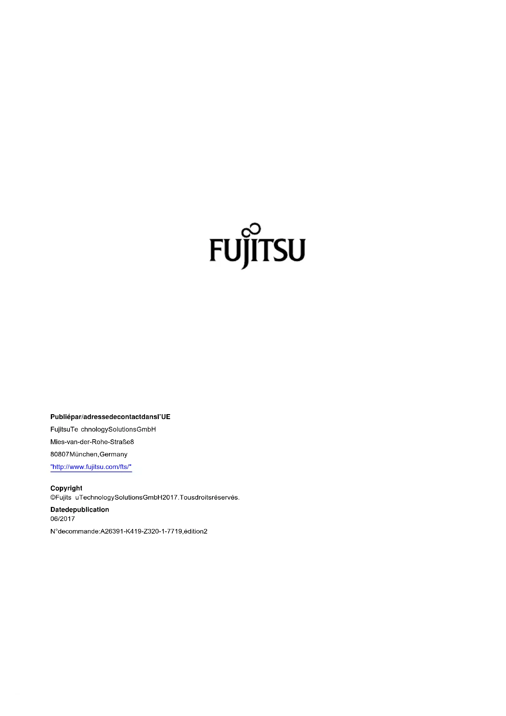 - votre p oint de vente Nous vous souhaitons beaucoup de plaisir avec votre nouveau système Fujitsu !Publié par / adresse de contact dans l’UE Fujitsu Te chnology Solutions GmbH Mies-van-der-Rohe-Straße 8 80807 München, Germany