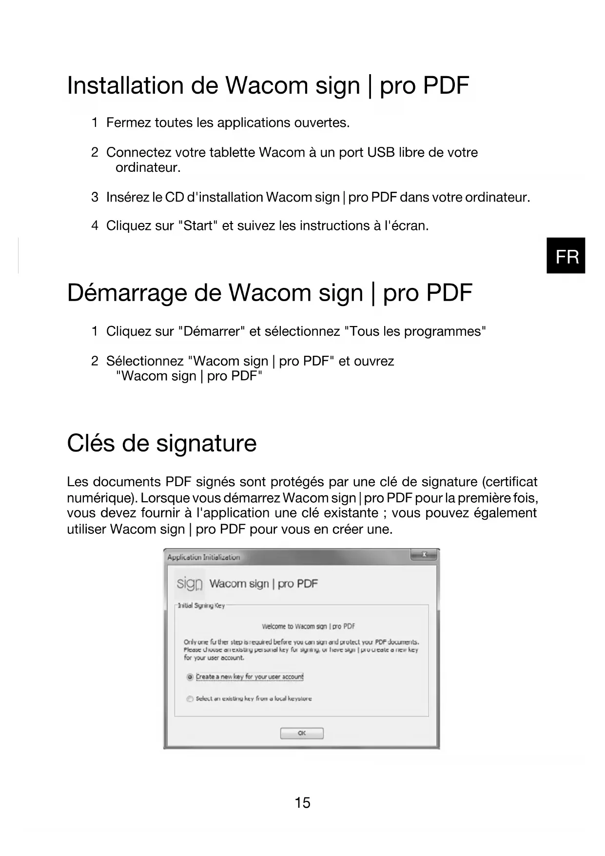 Installation de Wacom sign | pro PDF 1 Fermez toutes les applications ouvertes. 2 Connectez votre tablette Wacom à un port USB libre de votre ordinateur. 3 Insérez le CD d'installation Wacom sign | pro PDF dans votre ordinateur. 4 Cliquez sur "Start" et suivez les instructions à l'écran. Démarrage de Wacom sign | pro PDF 1 Cliquez sur "Démarrer" et sélectionnez "Tous les programmes" 2 Sélectionnez "Wacom sign | pro PDF" et ouvrez "Wacom sign | pro PDF" Clés de signature Les documents PDF signés sont protégés par une clé de signature (certificat numérique). Lorsque vous démarrez Wacom sign | pro PDF pour la première fois, vous devez fournir à l'application une clé existante ; vous pouvez également utiliser Wacom sign | pro PDF pour vous en créer une.16