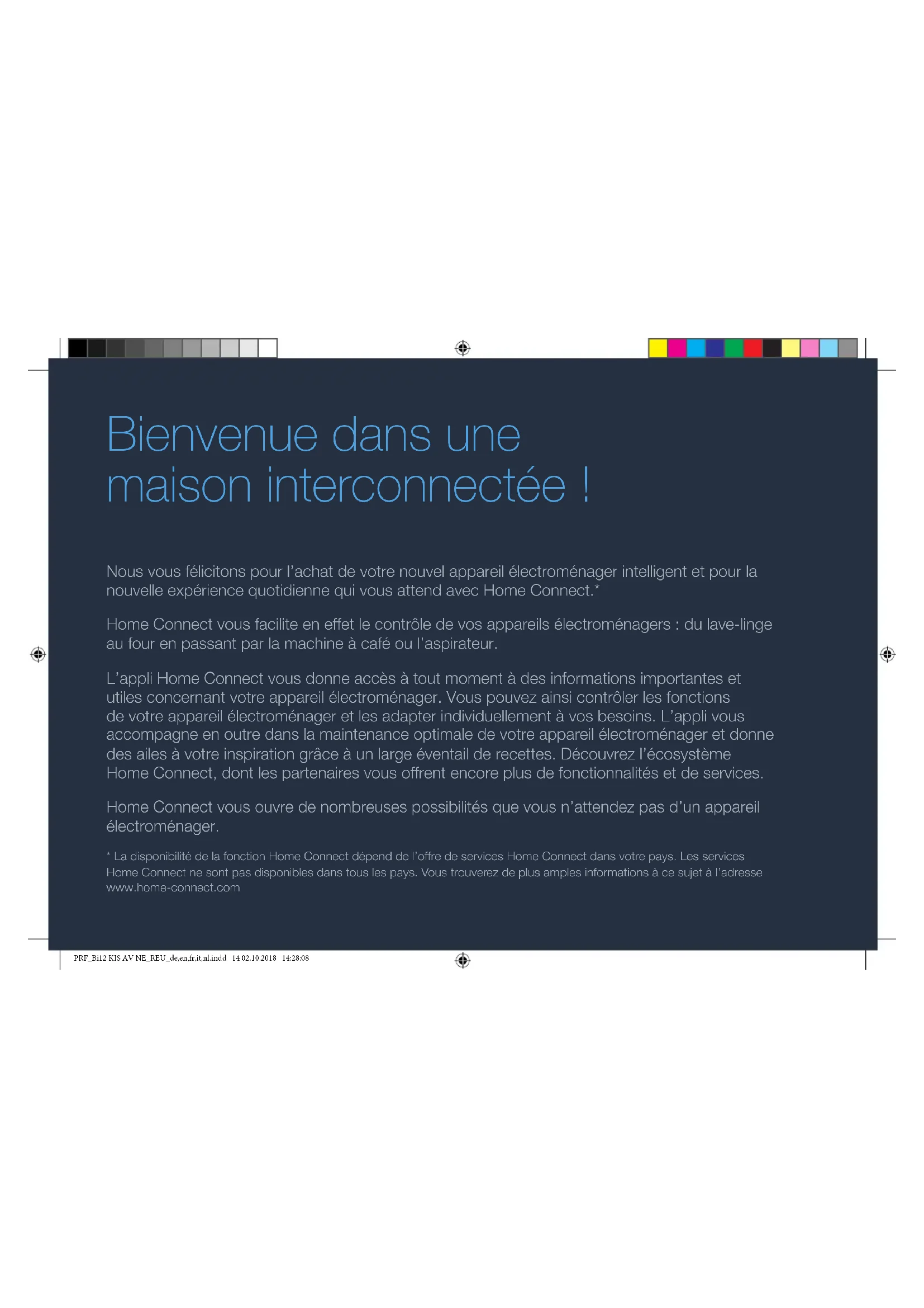 3 | Press the button on the freezer compartment. An animation appears in the freezer compartment temperature display. If connection is successful, "PA" appears in the refrigerator compartment temperature display and "On" in the freezer compartment temperature display. Note: If the connection could not be established, make sure your smartphone/tablet is within range of your W-Fi network. PRF_Bi12 KIS AV NE_REU_de,en,fr,it,nl.indd 13 02.10.2018 14:28:0814 DE Nous vous félicitons pour l’achat de votre nouvel appareil électroménager intelligent et pour la nouvelle expérience quotidienne qui vous attend avec HomeConnect.* HomeConnect vous facilite en effet le contrôle de vos appareils électroménagers: du lave-linge au four en passant par la machine à café ou l’aspirateur. L’appli HomeConnect vous donne accès à tout moment à des informations importantes et utiles concernant votre appareil électroménager. Vous pouvez ainsi contrôler les fonctions de votre appareil électroménager et les adapter individuellement à vos besoins. L’appli vous accompagne en outre dans la maintenance optimale de votre appareil électroménager et donne des ailes à votre inspiration grâce à un large éventail de recettes. Découvrez l’écosystème HomeConnect, dont les partenaires vous offrent encore plus de fonctionnalités et de services. HomeConnect vous ouvre de nombreuses possibilités que vous n’attendez pas d’un appareil électroménager.
