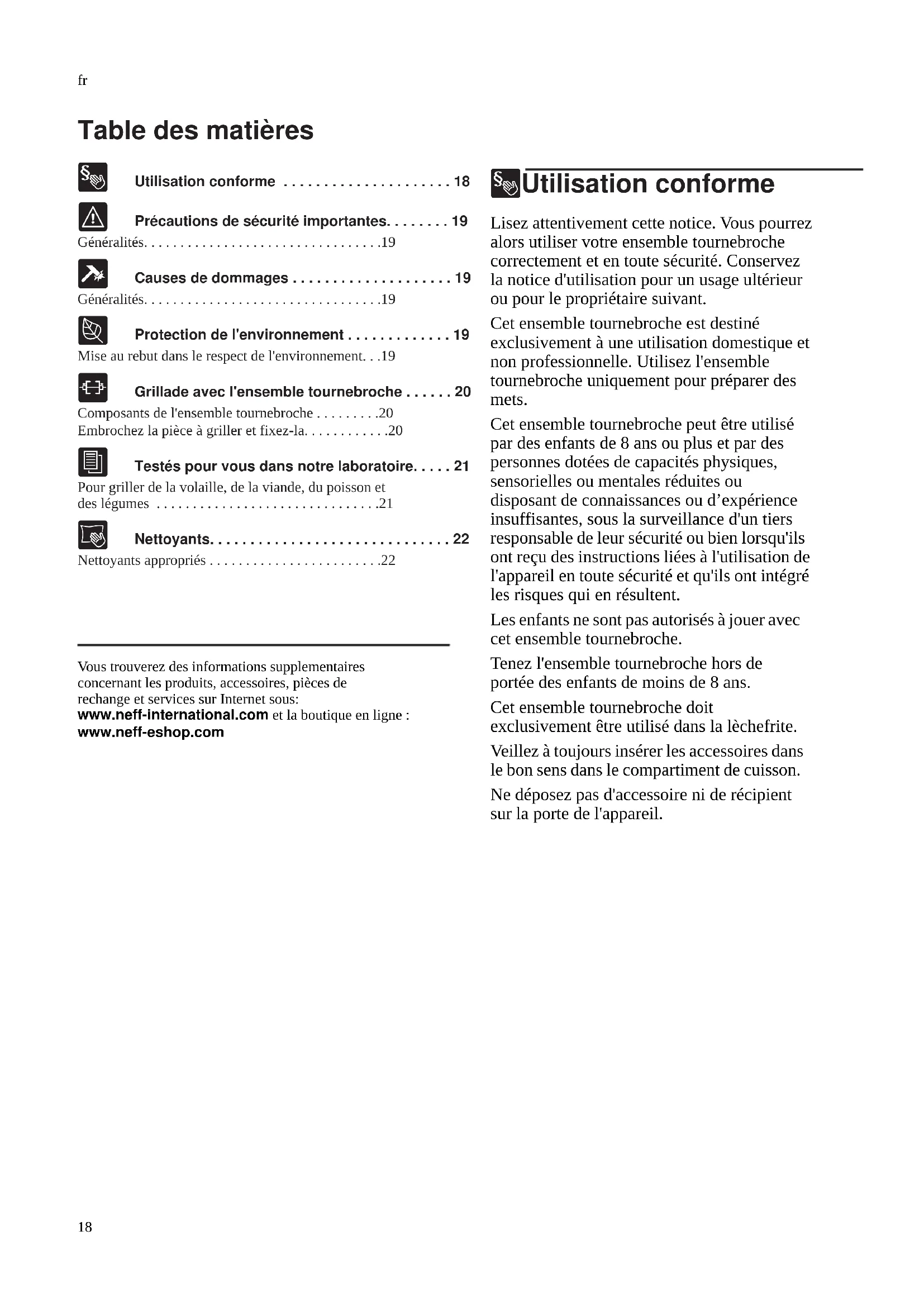 - Nettoyants appropriés Produktinfo Vous trouverez des informations supplementaires concernant les produits, accessoires, pièces de rechange et services sur Internet sous: www.neff-international.com et la boutique en ligne : www.neff-eshop.com 8Utilisation conforme Utilisation conforme Lisez attentivement cette notice. Vous pourrez alors utiliser votre ensemble tournebroche correctement et en toute sécurité. Conservez la notice d'utilisation pour un usage ultérieur ou pour le propriétaire suivant. Cet ensemble tournebroche est destiné exclusivement à une utilisation domestique et non professionnelle. Utilisez l'ensemble tournebroche uniquement pour préparer des mets. Cet ensemble tournebroche peut être utilisé par des enfants de 8 ans ou plus et par des personnes dotées de capacités physiques, sensorielles ou mentales réduites ou disposant de connaissances ou d’expérience insuffisantes, sous la surveillance d'un tiers responsable de leur sécurité ou bien lorsqu'ils ont reçu des instructions liées à l'utilisation de l'appareil en toute sécurité et qu'ils ont intégré les risques qui en résultent. Les enfants ne sont pas autorisés à jouer avec cet ensemble tournebroche. Tenez l'ensemble tournebroche hors de portée des enfants de moins de 8 ans. Cet ensemble tournebroche doit exclusivement être utilisé dans la lèchefrite. Veillez à toujours insérer les accessoires dans le bon sens dans le compartiment de cuisson. Ne déposez pas d'accessoire ni de récipient sur la porte de l'appareil.Précautions de sécurité importantes fr p. 22