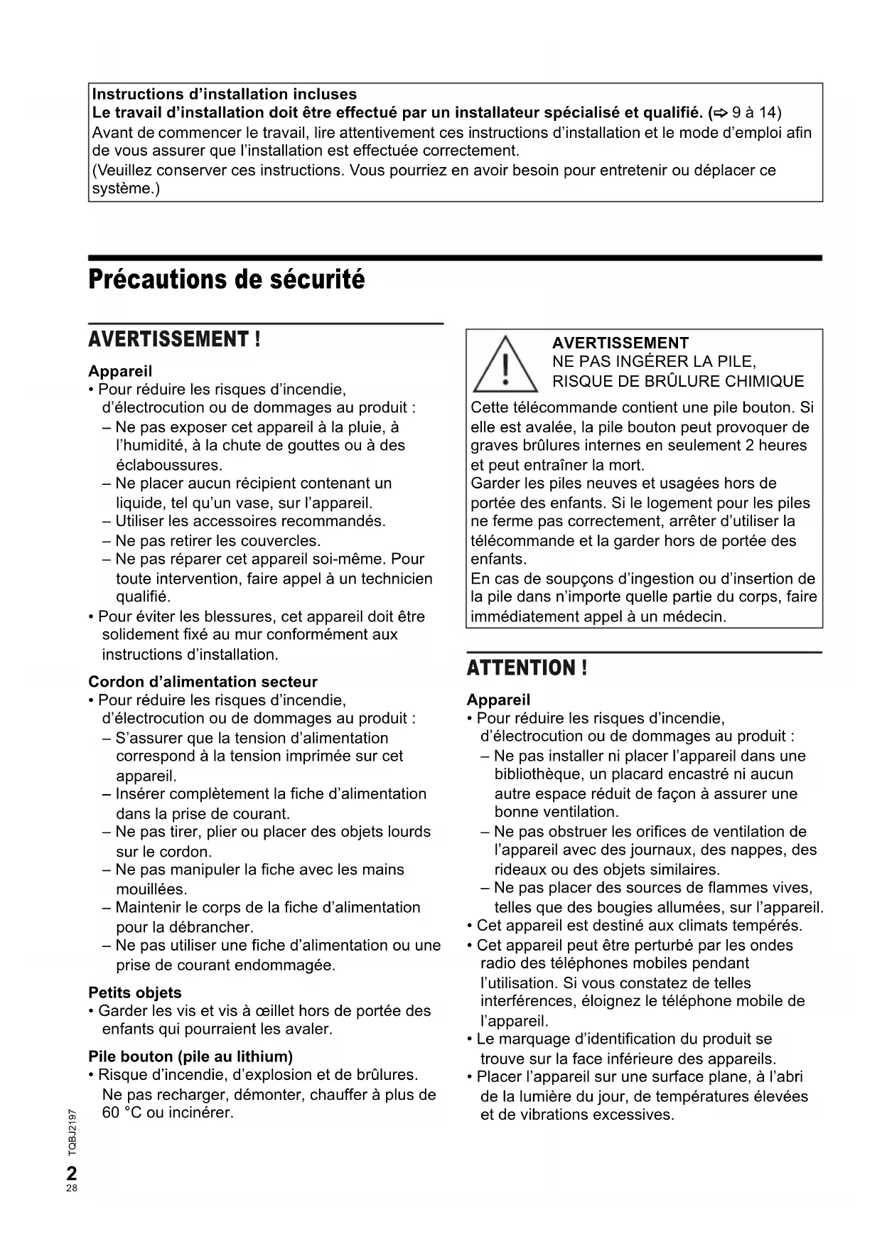 Cette télécommande contient une pile bouton. Si elle est avalée, la pile bouton peut provoquer de graves brûlures internes en seulement 2 heures et peut entraîner la mort.