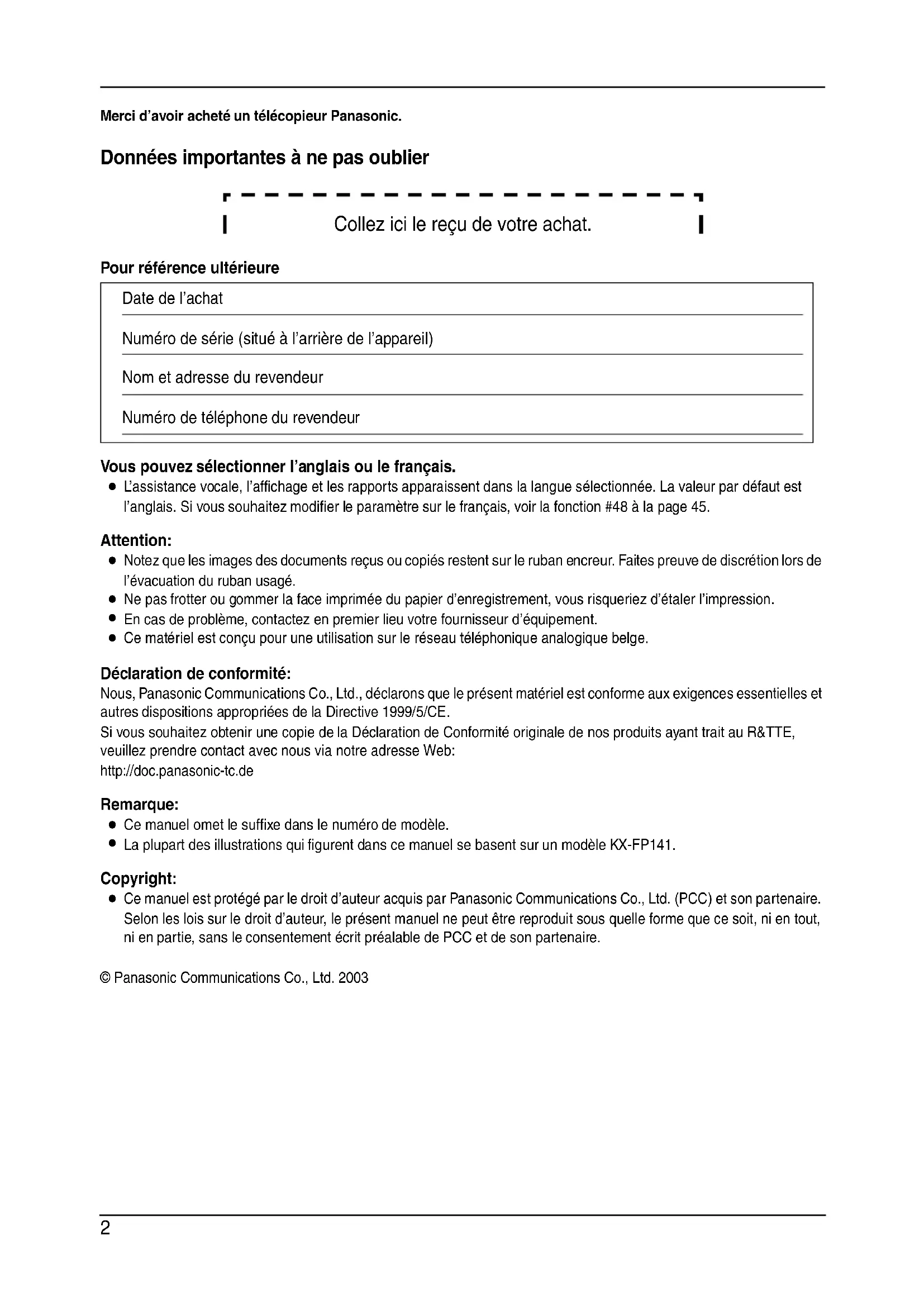 Merci d'avoir acheté un télécopieur Panasonic.