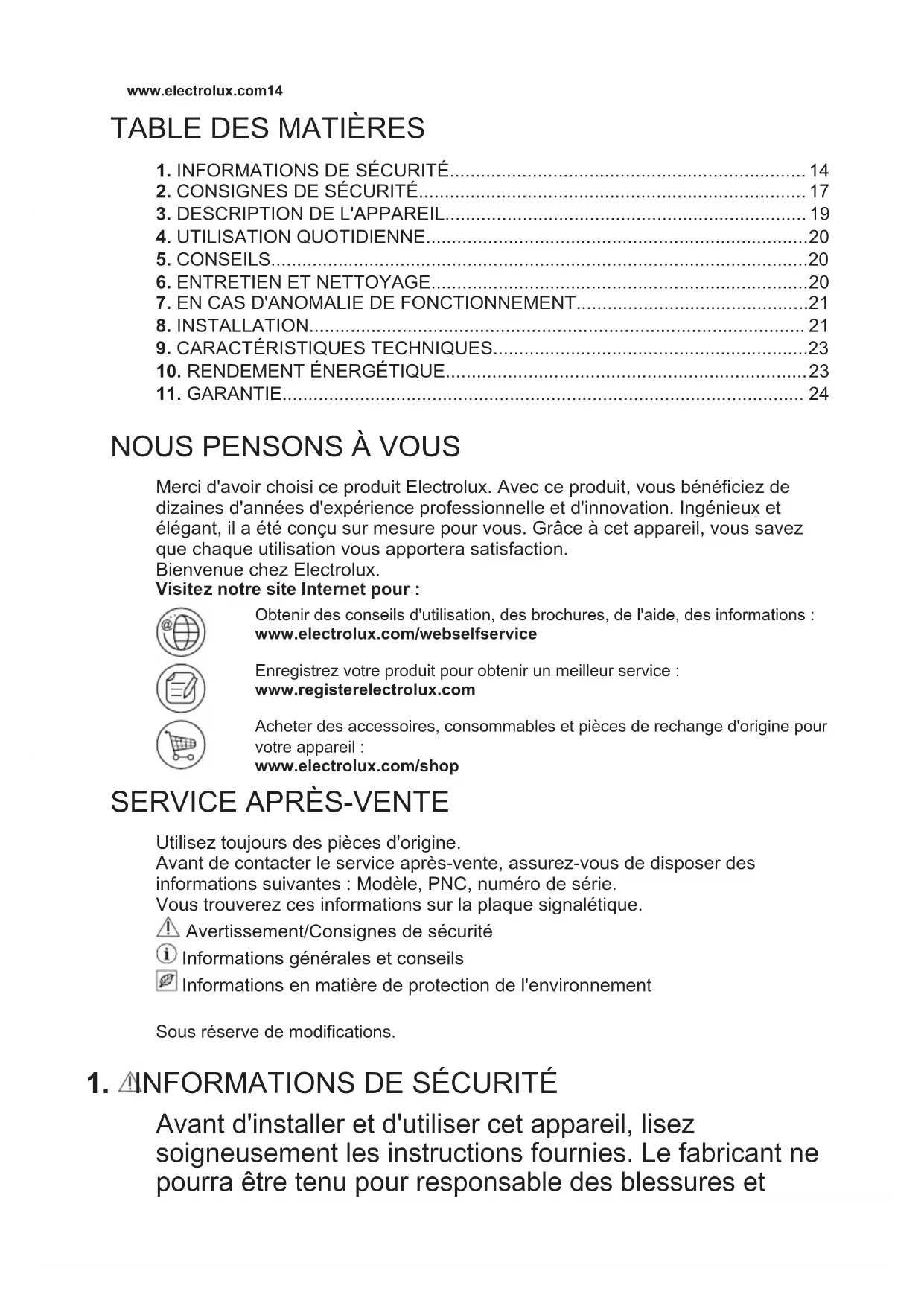 Merci d'avoir choisi ce produit Electrolux. Avec ce produit, vous bénéficiez de dizaines d'années d'expérience professionnelle et d'innovation. Ingénieux et élégant, il a été conçu sur mesure pour vous. Grâce à cet appareil, vous savez que chaque utilisation vous apportera satisfaction. Bienvenue chez Electrolux. Visitez notre site Internet pour : Obtenir des conseils d'utilisation, des brochures, de l'aide, des informations : www.electrolux.com/webselfservice Enregistrez votre produit pour obtenir un meilleur service : www.registerelectrolux.com Acheter des accessoires, consommables et pièces de rechange d'origine pour votre appareil : www.electrolux.com/shop
