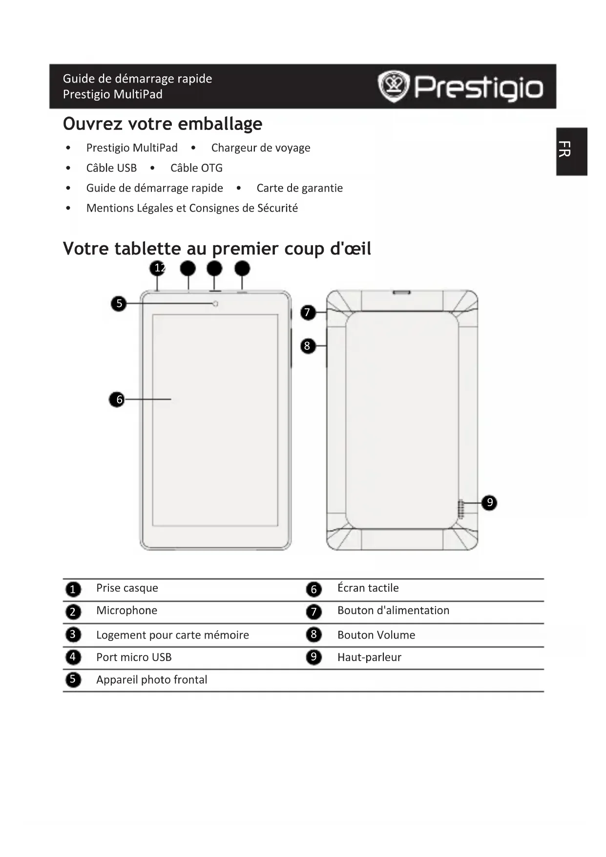 AppareilphotofrontalFR Guide de démarrage rapide Prestigio MultiPad Boutons Bouton Définition Fonction Alimentation