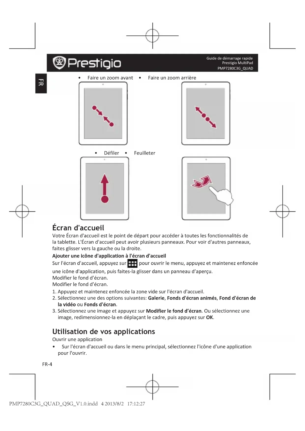 - Surl'écrand'accueiloudanslemenuprincipal,sélectionnezl'icôned'uneapplication pourl'ouvrir. PMP7280C3G_QUAD_QSG_V1.0.indd 4 2013/8/2 17:12:27FR-5