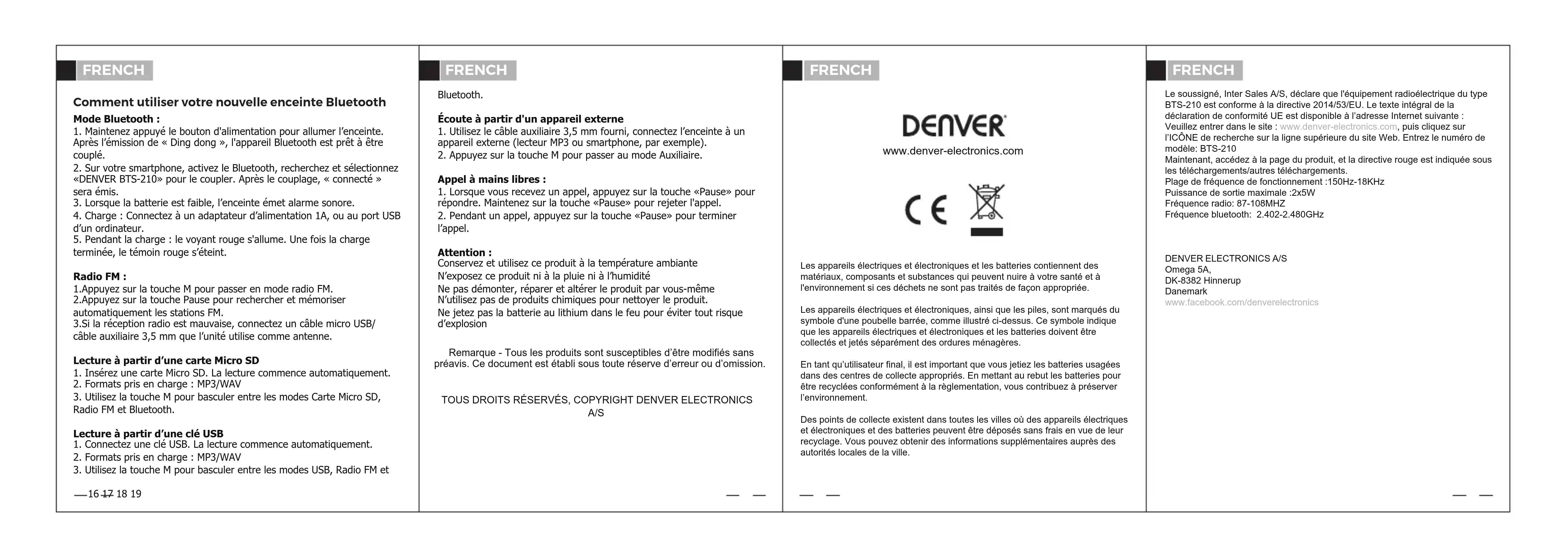 l’appel. Attention : Conservez et utilisez ce produit à la température ambiante N’exposez ce produit ni à la pluie ni à l’humidité Ne pas démonter, réparer et altérer le produit par vous-même N’utilisez pas de produits chimiques pour nettoyer le produit. Ne jetez pas la batterie au lithium dans le feu pour éviter tout risque d’explosion FRENCH Les appareils électriques et électroniques et les batteries contiennent des matériaux, composants et substances qui peuvent nuire à votre santé et à l'environnement si ces déchets ne sont pas traités de façon appropriée. Les appareils électriques et électroniques, ainsi que les piles, sont marqués du symbole d'une poubelle barrée, comme illustré ci-dessus. Ce symbole indique que les appareils électriques et électroniques et les batteries doivent être collectés et jetés séparément des ordures ménagères. En tant qu’utilisateur final, il est important que vous jetiez les batteries usagées dans des centres de collecte appropriés. En mettant au rebut les batteries pour être recyclées conformément à la règlementation, vous contribuez à préserver l’environnement. Des points de collecte existent dans toutes les villes où des appareils électriques et électroniques et des batteries peuvent être déposés sans frais en vue de leur recyclage. Vous pouvez obtenir des informations supplémentaires auprès des autorités locales de la ville. Remarque - Tous les produits sont susceptibles d’être modifiés sans préavis. Ce document est établi sous toute réserve d’erreur ou d’omission. TOUS DROITS RÉSERVÉS, COPYRIGHT DENVER ELECTRONICS A/S www.denver-electronics.com FRENCH Le soussigné, Inter Sales A/S, déclare que l'équipement radioélectrique du type BTS-210 est conforme à la directive 2014/53/EU. Le texte intégral de la déclaration de conformité UE est disponible à l’adresse Internet suivante : Veuillez entrer dans le site : www.denver-electronics.com, puis cliquez sur l’ICÔNE de recherche sur la ligne supérieure du site Web. Entrez le numéro de modèle: BTS-210 Maintenant, accédez à la page du produit, et la directive rouge est indiquée sous les téléchargements/autres téléchargements. Plage de fréquence de fonctionnement :150Hz-18KHz Puissance de sortie maximale :2x5W Fréquence radio: 87-108MHZ Fréquence bluetooth: 2.402-2.480GHz
