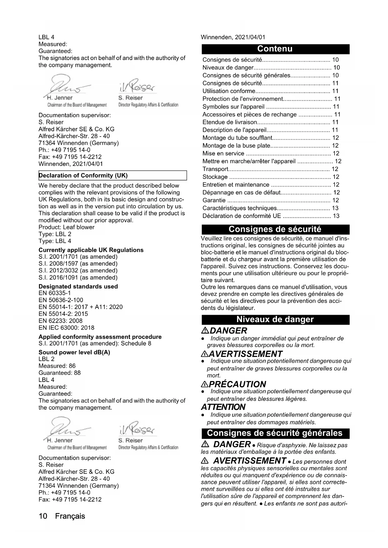 - dB(A) 88 96 EU Declaration of Conformity10 Français LBL 4 Measured: Guaranteed: The signatories act on behalf of and with the authority of the company management. Documentation supervisor: S. Reiser Alfred Kärcher SE & Co. KG Alfred-Kärcher-Str. 28 - 40 71364 Winnenden (Germany) Ph.: +49 7195 14-0 Fax: +49 7195 14-2212 Winnenden, 2021/04/01 We hereby declare that the product described below complies with the relevant provisions of the following UK Regulations, both in its basic design and construc- tion as well as in the version put into circulation by us. This declaration shall cease to be valid if the product is modified without our prior approval. Product: Leaf blower Type: LBL 2 Type: LBL 4 Currently applicable UK Regulations S.I. 2001/1701 (as amended) S.I. 2008/1597 (as amended) S.I. 2012/3032 (as amended) S.I. 2016/1091 (as amended) Designated standards used EN 60335-1 EN 50636-2-100 EN 55014-1: 2017 + A11: 2020 EN 55014-2: 2015 EN 62233: 2008 EN IEC 63000: 2018 Applied conformity assessment procedure S.I. 2001/1701 (as amended): Schedule 8 Sound power level dB(A) LBL 2 Measured: 86 Guaranteed: 88 LBL 4 Measured: Guaranteed: The signatories act on behalf of and with the authority of the company management. Documentation supervisor: S. Reiser Alfred Kärcher SE & Co. KG Alfred-Kärcher-Str. 28 - 40 71364 Winnenden (Germany) Ph.: +49 7195 14-0 Fax: +49 7195 14-2212 Winnenden, 2021/04/01 Contenu Consignes de sécurité Veuillez lire ces consignes de sécurité, ce manuel d'ins- tructions original, les consignes de sécurité jointes au bloc-batterie et le manuel d'instructions original du bloc- batterie et du chargeur avant la première utilisation de l'appareil. Suivez ces instructions. Conservez les docu- ments pour une utilisation ultérieure ou pour le proprié- taire suivant. Outre les remarques dans ce manuel d'utilisation, vous devez prendre en compte les directives générales de sécurité et les directives pour la prévention des acci- dents du législateur. Niveaux de danger DANGER ● Indique un danger immédiat qui peut entraîner de graves blessures corporelles ou la mort. 몇 AVERTISSEMENT ● Indique une situation potentiellement dangereuse qui peut entraîner de graves blessures corporelles ou la mort. 몇 PRÉCAUTION ● Indique une situation potentiellement dangereuse qui peut entraîner des blessures légères. ATTENTION ● Indique une situation potentiellement dangereuse qui peut entraîner des dommages matériels. Consignes de sécurité générales DANGER ● Risque d'asphyxie. Ne laissez pas les matériaux d'emballage à la portée des enfants. 몇 AVERTISSEMENT ● Les personnes dont les capacités physiques sensorielles ou mentales sont réduites ou qui manquent d'expérience ou de connais- sance peuvent utiliser l'appareil, si elles sont correcte- ment surveillées ou si elles ont été instruites sur l'utilisation sûre de l'appareil et comprennent les dan- gers qui en résultent. ● Les enfants ne sont pas autori- Declaration of Conformity (UK) Consignes de sécurité p. 10