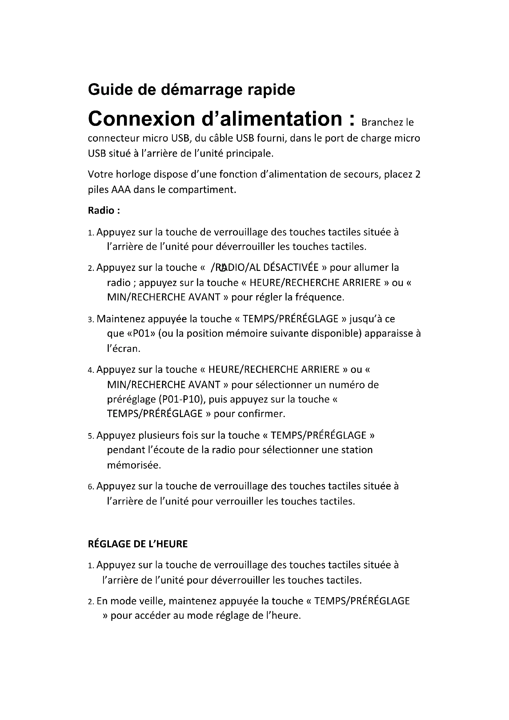 Guide de démarrage rapide Connexion d’alimentation : Branchez le connecteur micro USB, du câble USB fourni, dans le port de charge micro USB situé à l’arrière de l’unité principale. Votre horloge dispose d’une fonction d’alimentation de secours, placez 2 piles AAA dans le compartiment. Radio :