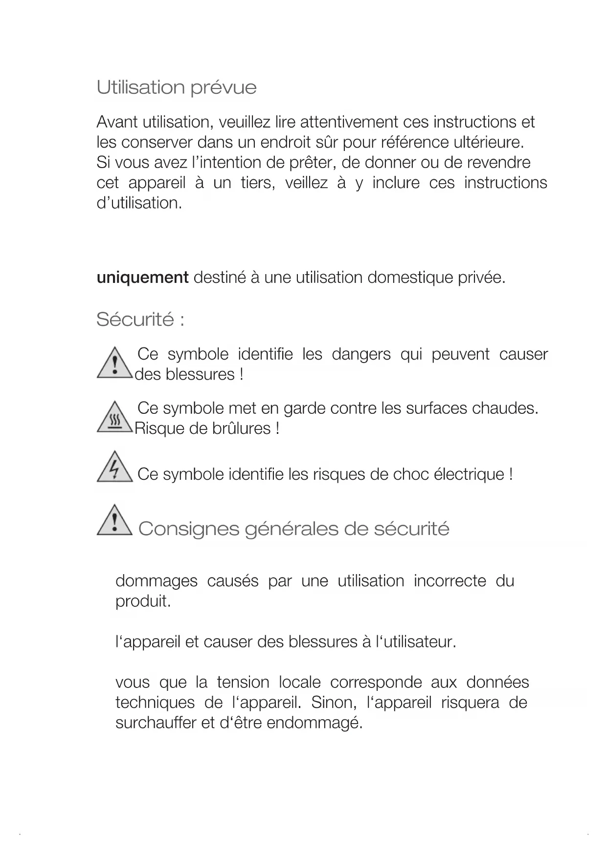 séparé. Consignes spéciales de sécurité AVERTISSEMENT ! Pour éviter les risques de blessures/ dommages de l‘appareil, de choc électrique et de brûlures.