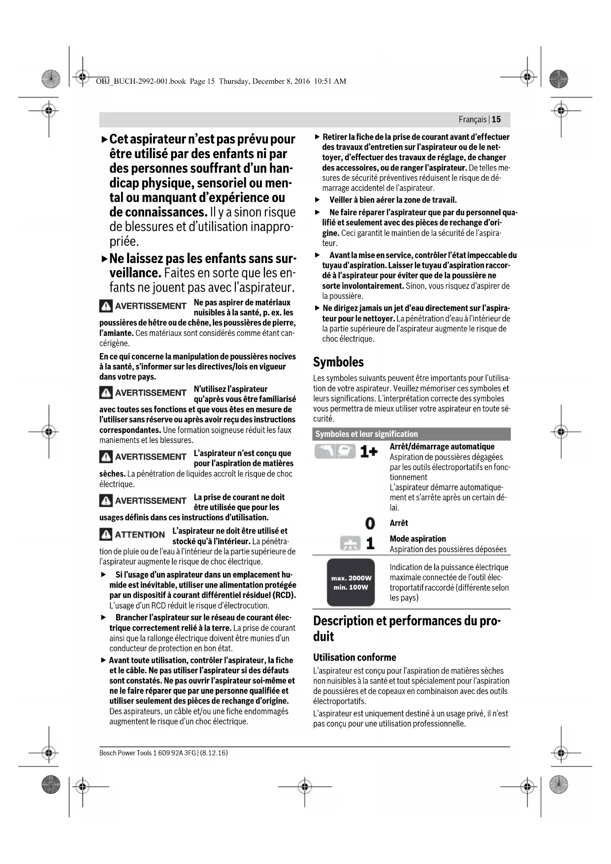 - Indication de la puissance électrique maximale connectée de l’outil électroportatif raccordé (différente selon les pays) OBJ_BUCH-2992-001.book Page 16 Thursday, December 8, 2016 10:51 AMFrançais | 17 Bosch Power Tools 1 609 92A 3FG | (8.12.16) Montage/remplacement du sac à poussières (accessoire) – Actionnez la touche de déverrouillage 8 et dégagez le bac à poussière 9 de l’aspirateur. – Saisissez le couvercle 17 au niveau de la bride de raccor- dement 16 et retirez-le du bac à poussière. – Retournez le couvercle 17. – Placez le sac à poussière 18 au-dessus de la bride de rac- cordement 16 de l’aspirateur et faites-le pivoter jusqu’à ce que les languettes en carton viennent se loger sous les pattes de maintien 19. – Replacez le couvercle 17 sur le bac à poussière 9 et insérez ensuite le bac à poussière dans l’aspirateur jusqu’à ce qu’il s’enclenche de manière audible. – Pour retirer un sac à poussières plein 18, faites-le pivoter – sans retourner le couvercle 17 – et dégagez-le vers le bas de la bride de raccordement 16. Mise en marche Avant d’effectuer des travaux sur l’aspirateur, retirer la fiche de la prise de courant. Mise en service Tenez compte de la tension du réseau ! La tension de la source de courant doit correspondre aux indications se trouvant sur la plaque signalétique de l’aspirateur. Les outils électroportatifs marqués 230 V peuvent égale- ment être mis en service sous 220 V. Assurez-vous que le filtre est en parfait état (sans fis- sures, petits trous, etc.). Remplacez aussitôt le filtre s’il est endommagé. Afin d’économiser l’énergie, ne mettez en marche l’aspirateur que quand vous l’utilisez. Pour garantir une puissance d’aspiration optimale, déroulez toujours le tuyau d’aspiration 10 entièrement de la partie su- périeure de l’aspirateur . Aspiration des poussières déposées Aspiration de poussières dégagées par les outils électro- portatifs en fonctionnement (voir figure D) L’aspirateur est équipé d’une prise de courant avec contact de mise à la terre 4 intégrée. Il est possible d’y connecter un outil électroportatif externe. Respectez la puissance élec- trique maximale connectée de l’outil électroportatif raccordé. – Montez l’adaptateur d’aspiration 12 (voir « Montage de l’adaptateur d’aspiration ou de la buse coudée », page 16). – Emboîtez l’adaptateur d’aspiration 12 dans le raccord d’aspiration de l’outil électroportatif. Note : Lors d’une utilisation avec des outils électroportatifs caractérisés par une faible arrivée d’air dans le tuyau d’aspira- tion (scies sauteuses, ponceuses, etc.), il convient d’ouvrir l’orifice d’air parasite 20 du tuyau d’aspiration 10. Cela amé- liore les performances d’aspiration de l’aspirateur et de l’outil électroportatif. Pour cela, tournez la bague recouvrant l’orifice d’air parasite 20, jusqu’à obtenir l’ouverture maximale. –Pour la mise en marche de l’aspirateur, mettez en marche l’outil électroportatif raccordé à la prise 4. L’aspirateur se met automatiquement en marche. – Arrêtez l’outil électroportatif pour terminer l’aspiration. La fonction de marche à vide de l’arrêt/du démarrage auto- matique continue à fonctionner pendant 6 secondes pour évacuer les poussières résiduelles du tuyau d’aspiration. Entretien et Service Après-Vente Nettoyage et entretien Avant d’effectuer des travaux sur l’aspirateur, retirer la fiche de la prise de courant. Toujours tenir propres l’outil électroportatif ainsi que les fentes de ventilation afin d’obtenir un travail impec- cable et sûr. Si le remplacement du câble d’alimentation est nécessaire, ceci ne doit être effectué que par Bosch ou une station de Ser- vice Après-Vente agréée pour outillage Bosch afin d’éviter des dangers de sécurité. Nettoyage du filtre (voir figures E1–E3) – Actionnez la touche de déverrouillage 8 et dégagez le bac à poussière 9 de l’aspirateur. – Retirez le filtre en toile 21 avec son support et brossez le filtre en toile avec une brosse souple. – Saisissez le filtre plat à plis 22 au niveau des languettes et retirez-le avec son support. Brossez le filtre plat à plis avec une brosse souple ou rin- cez-le à l’eau courante et laissez-le ensuite sécher complè- tement. – Réinsérez le filtre nettoyé en veillant à ce qu’il soit bien en place. Nettoyage du bac à poussière – Essuyez le bac à poussière 9 de temps en temps avec un produit de nettoyage non abrasif du commerce et laissez- le bien sécher. Nettoyage du filtre permanent (voir figure F) Nettoyez le filtre permanent 24 de temps en temps pour que l’aspirateur reste pleinement performant. – Ouvrez la grille de sortie d’air 23 et retirez le filtre perma- nent 24. – Rincez le filtre permanent 24 à l’eau courante et laissez-le ensuite bien sécher. –Pour mettre en marche l’aspirateur, placez le sélecteur de mode de fonctionnement 2 sur le symbole « Aspiration ». –Pour arrêter l’aspirateur, placez le sélecteur de mode de fonctionnement 2 sur le sym- bole « Arrêt ». –Pour activer la fonction de mise en marche/arrêt automatique de l’as- pirateur, placez le sélecteur de mode de fonctionnement 2 sur le symbole « Mise en marche/arrêt automatique ». –Pour arrêter l’aspirateur, placez le sélecteur de mode de fonctionnement 2 sur le sym- bole « Arrêt ». OBJ_BUCH-2992-001.book Page 17 Thursday, December 8, 2016 10:51 AM18 | Español 1 609 92A 3FG | (8.12.16) Bosch Power Tools – Réinsérez le filtre nettoyé en veillant à ce qu’il soit bien en place.Refermez la grille de sortie d’air. Dérangements Au cas où la capacité d’aspiration serait insuffisante, contrô- lez si : – Le système des tuyaux flexibles est obstrué ? – Les filtres sont-ils chargés de poussière ? – Le bac à poussière 9 est-il plein ? 