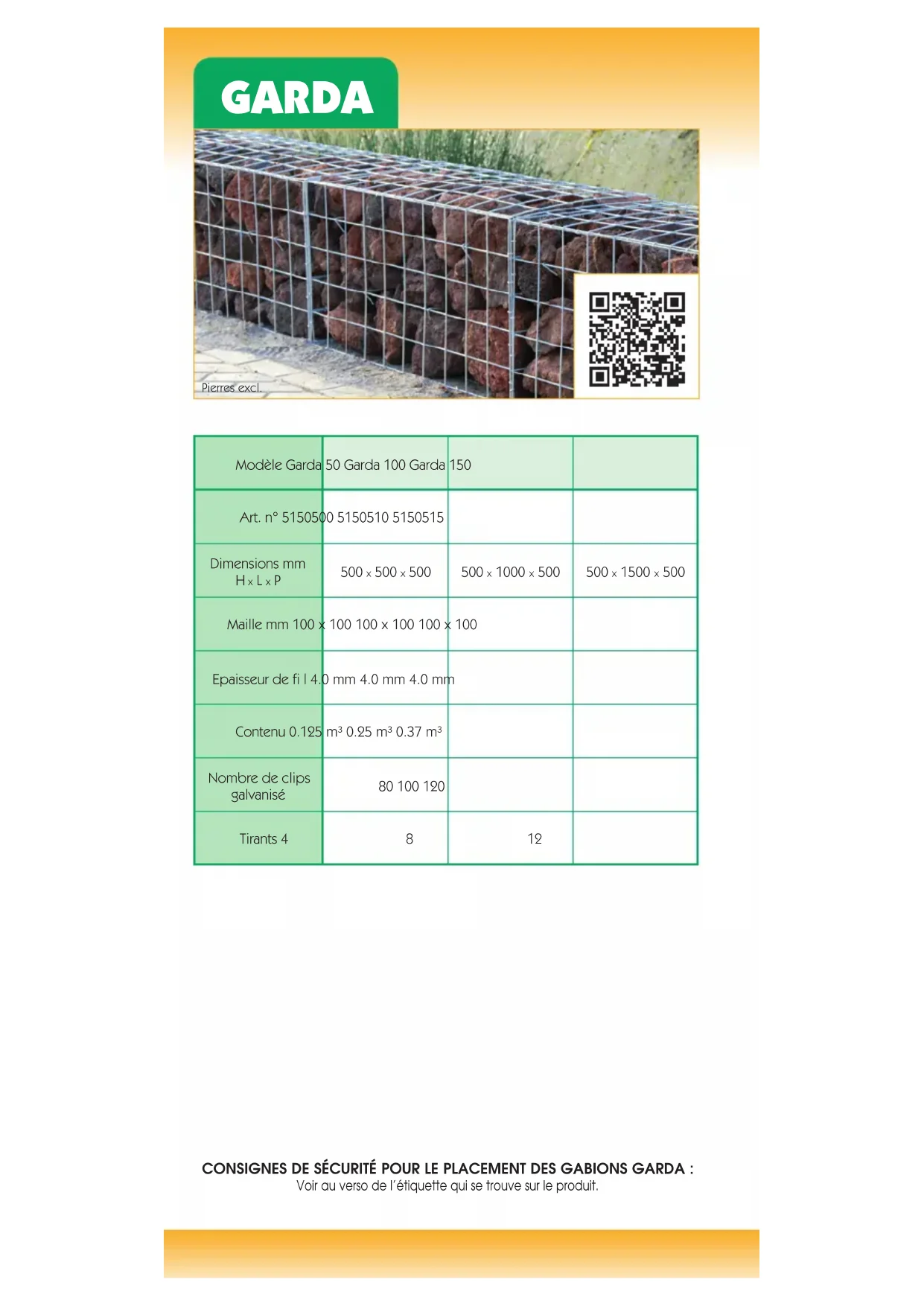 CONSIGNES DE SECURITE POUR LE PLACEMENT DES GABIONS VARESE : Voir au versus de I'etiquette qui se fouve sur le produit.