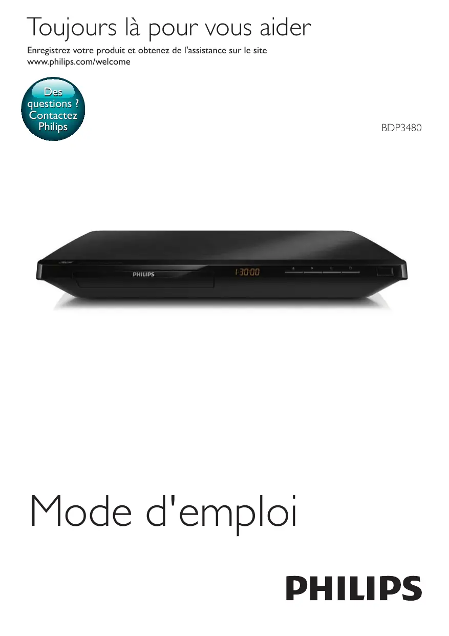 Toujours là pour vous aider Enregistrez votre produit et obtenez de l'assistance sur le site www.philips.com/welcome Des questions ? Contactez Philips Mode d'emploi BDP3480 Avant de connecter ce lecteur de disques Blu-ray/DVD, assurez-vous d’avoir bien lu et compris l’ensemble des instructions fournies.