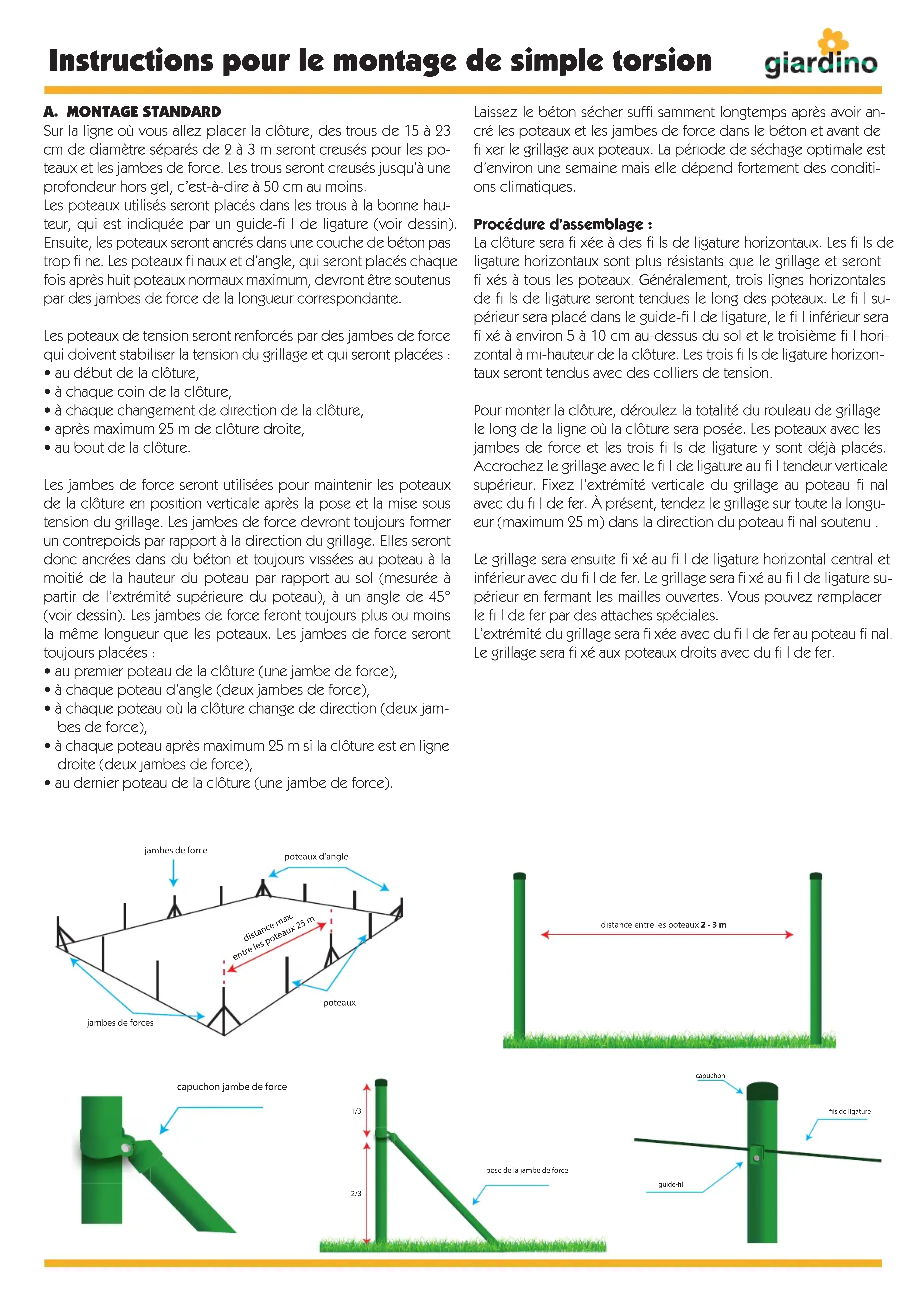 - à chaque poteau après maximum 25 m si la clôture est en ligne droite (deux jambes de force),