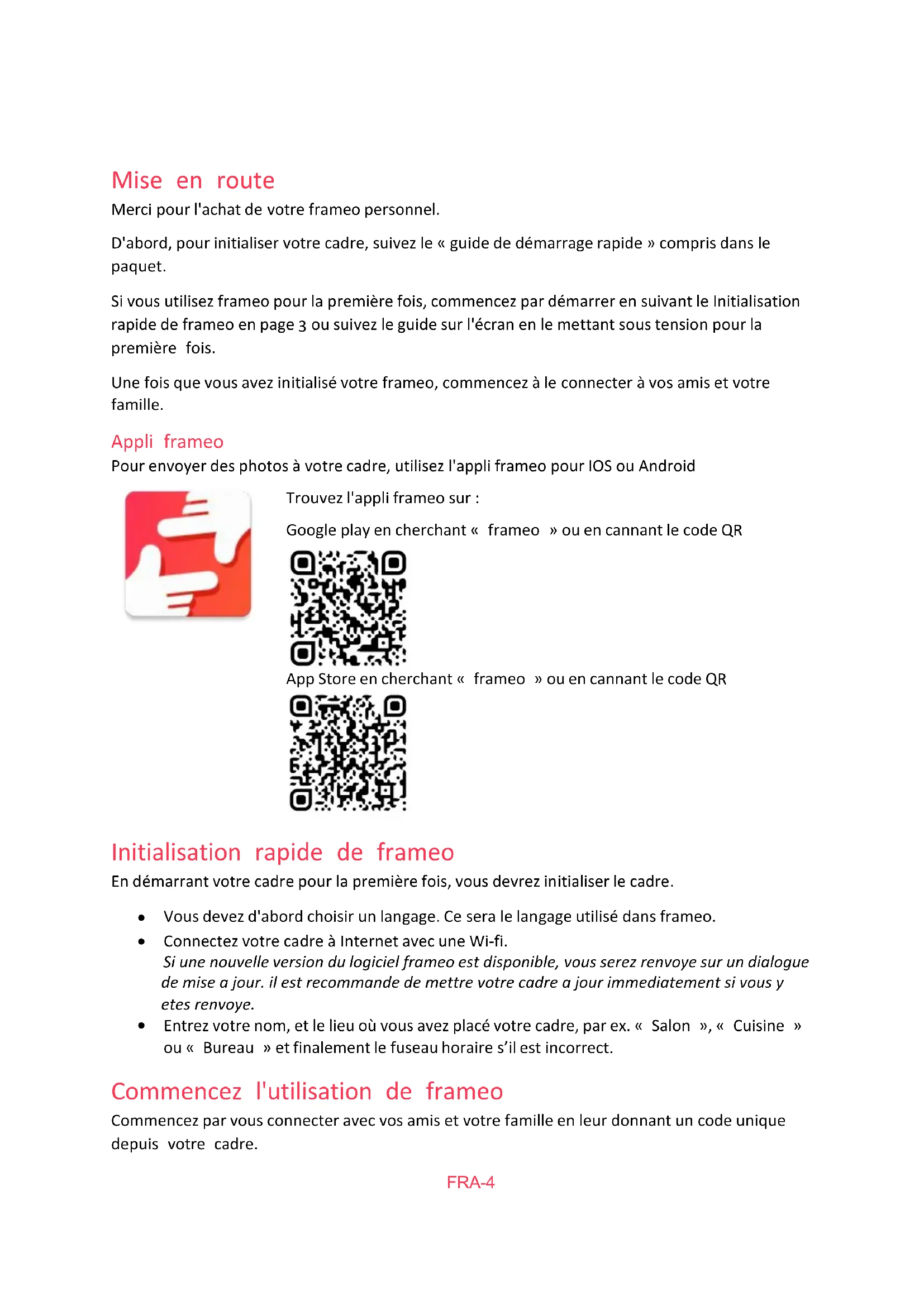 FRA-3Mise en route Merci pour l'achat de votre frameo personnel. D'abord, pour initialiser votre cadre, suivez le « guide de démarrage rapide » compris dans le paquet. Si vous utilisez frameo pour la première fois, commencez par démarrer en suivant le Initialisation rapide de frameo en page 3 ou suivez le guide sur l'écran en le mettant sous tension pour la première fois. Une fois que vous avez initialisé votre frameo, commencez à le connecter à vos amis et votre famille. Appli frameo Pour envoyer des photos à votre cadre, utilisez l'appli frameo pour IOS ou Android Trouvez l'appli frameo sur : Google play en cherchant « frameo » ou en cannant le code QR App Store en cherchant « frameo » ou en cannant le code QR Initialisation rapide de frameo En démarrant votre cadre pour la première fois, vous devrez initialiser le cadre.