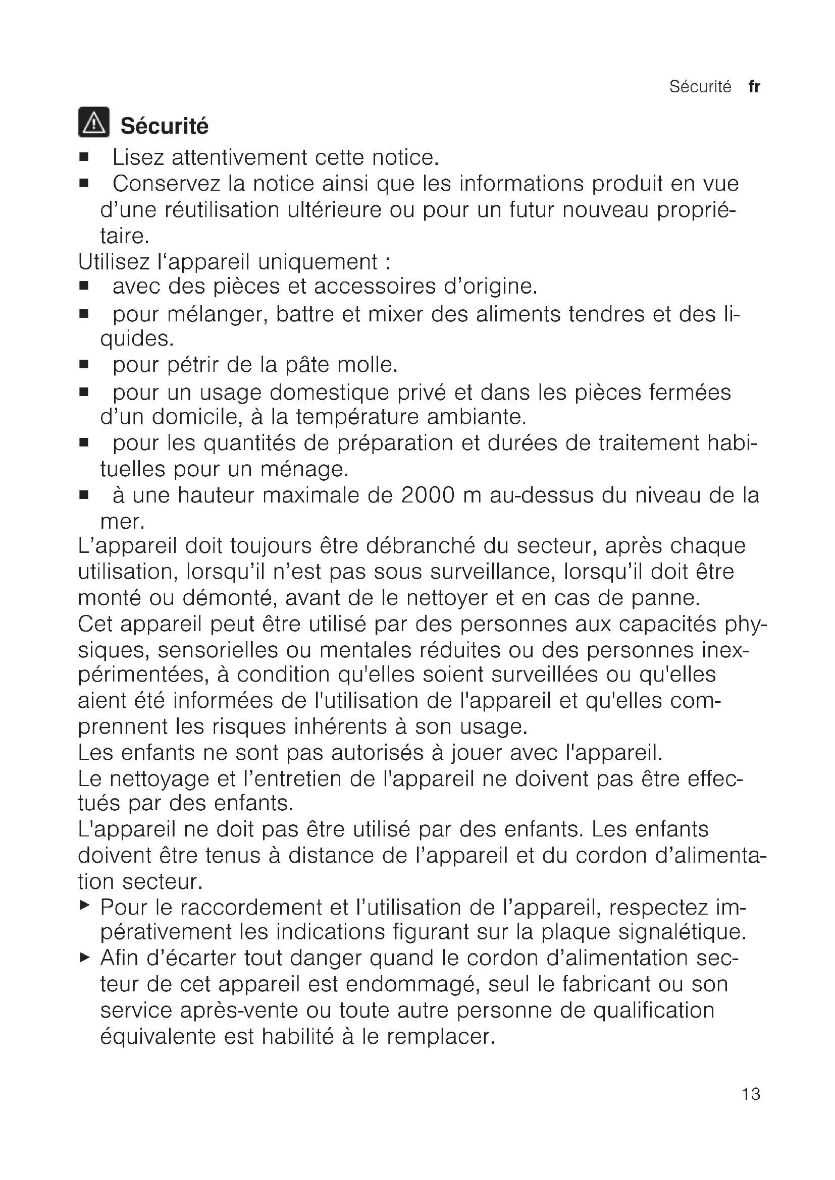 Sécurité ¡ Lisez attentivement cette notice. ¡ Conservez la notice ainsi que les informations produit en vue d’une réutilisation ultérieure ou pour un futur nouveau proprié- taire. Utilisez l‘appareil uniquement: ¡ avec des pièces et accessoires d’origine. ¡ pour mélanger, battre et mixer des aliments tendres et des li- quides. ¡ pour pétrir de la pâte molle. ¡ pour un usage domestique privé et dans les pièces fermées d’un domicile, à la température ambiante. ¡ pour les quantités de préparation et durées de traitement habi- tuelles pour un ménage. ¡ à une hauteur maximale de 2000m au-dessus du niveau de la mer. L’appareil doit toujours être débranché du secteur, après chaque utilisation, lorsqu’il n’est pas sous surveillance, lorsqu’il doit être monté ou démonté, avant de le nettoyer et en cas de panne. Cet appareil peut être utilisé par des personnes aux capacités phy- siques, sensorielles ou mentales réduites ou des personnes inex- périmentées, à condition qu'elles soient surveillées ou qu'elles aient été informées de l'utilisation de l'appareil et qu'elles com- prennent les risques inhérents à son usage. Les enfants ne sont pas autorisés à jouer avec l'appareil. Le nettoyage et l’entretien de l'appareil ne doivent pas être effec- tués par des enfants. L'appareil ne doit pas être utilisé par des enfants. Les enfants doivent être tenus à distance de l’appareil et du cordon d’alimenta- tion secteur.