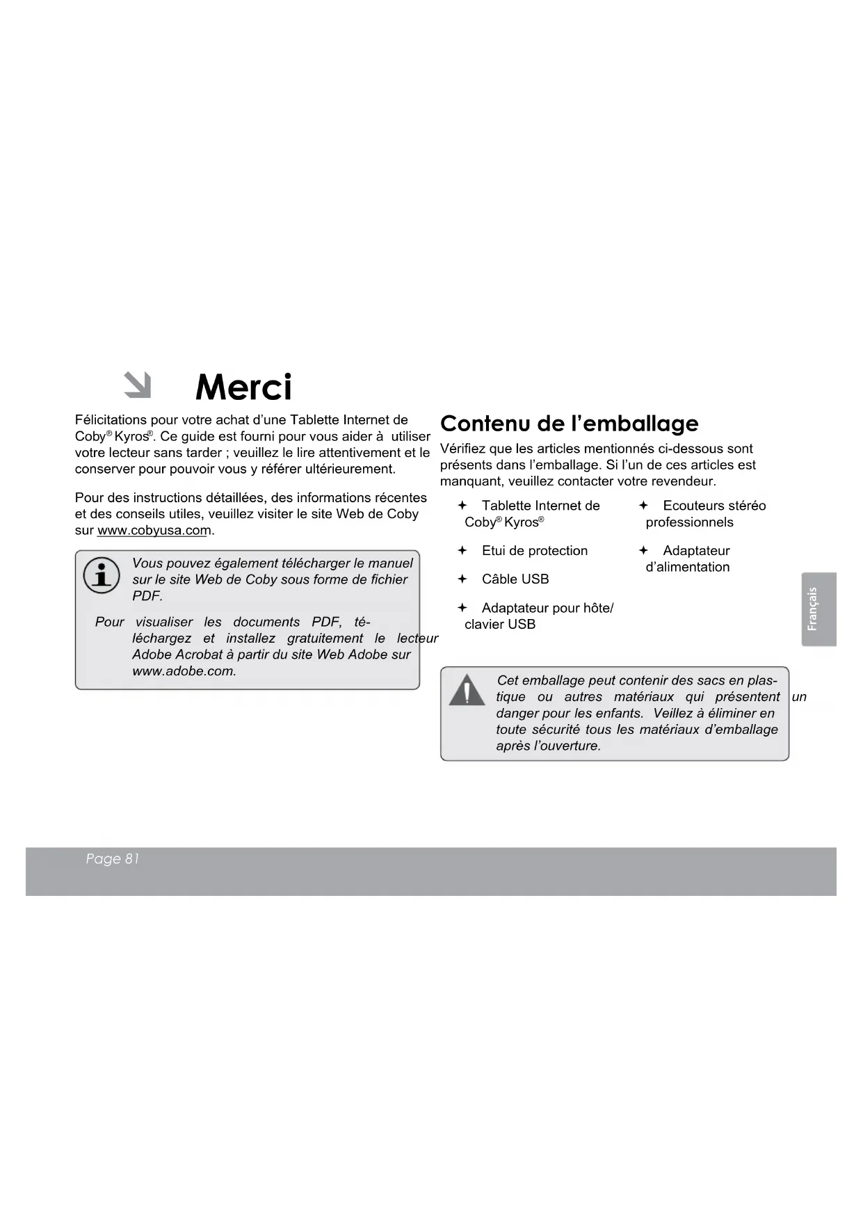 Français Page 81  Merci Félicitations pour votre achat d’une Tablette Internet de Coby
