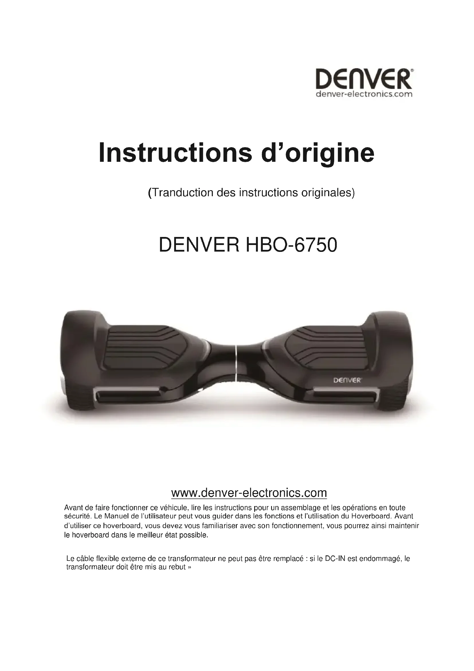 y, por lo tanto, cumple con las exigencies esenciales del a Directiva sobre Máquinas. La identidad y la firma del a persona facultada para redactor la declaración y compilar los archivos técnicos de parte del fabricante: Firma: Nombrecompleto: Alfred Blank Puesto: CEO Empresa: DENVER ELECTRONICS A/S Fecha: 27th July 2020Instructions d’origine (Tranduction des instructions originales) DENVER HBO-6750 www.denver-electronics.com Avant de faire fonctionner ce véhicule, lire les instructions pour un assemblage et les opérations en toute sécurité. Le Manuel de l’utilisateur peut vous guider dans les fonctions et l’utilisation du Hoverboard. Avant d’utiliser ce hoverboard, vous devez vous familiariser avec son fonctionnement, vous pourrez ainsi maintenir le hoverboard dans le meilleur état possible. Le câble flexible externe de ce transformateur ne peut pas être remplacé : si le DC-IN est endommagé, le transformateur doit être mis au rebut »FRA 1 Cet appareil peut être utilisé par des enfants de 8 ans et plus ainsi que par des personnes dont les capacités physiques, sensorielles ou mentales sont réduites, ou qui ne disposent pas des connaissances ou de l'expérience nécessaires, à moins qu'elles n'aient été formées et encadrées pour l'utilisation de cet appareil par une personne responsable de leur sécurité. Les enfants ne doivent pas jouer avec l'appareil. Le nettoyage et l’entretien ne doivent pas être effectués par des enfants sans surveillance. Attention: pile au lithium à l'intérieur
