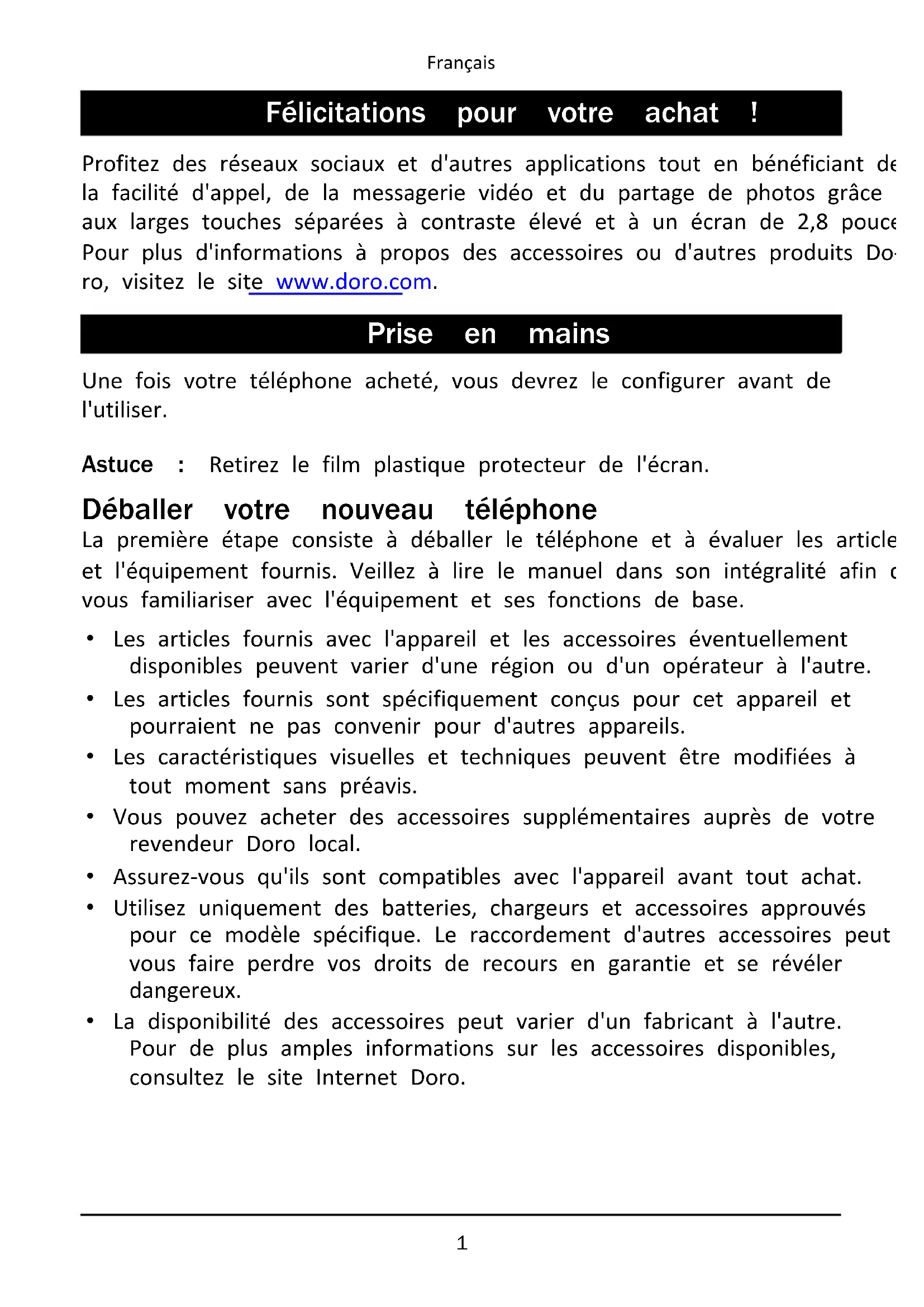 Les articles fournis avec votre téléphone sont susceptibles de varier en fonction du logiciel et des accessoires disponibles dans votre région ou offerts par votre opérateur. Vous pouvez vous procurer des accessoires supplémentaires auprès de votre vendeur Doro local. Les accessoires fournis sont conçus pour fonctionner de manière optimale avec votre téléphone.