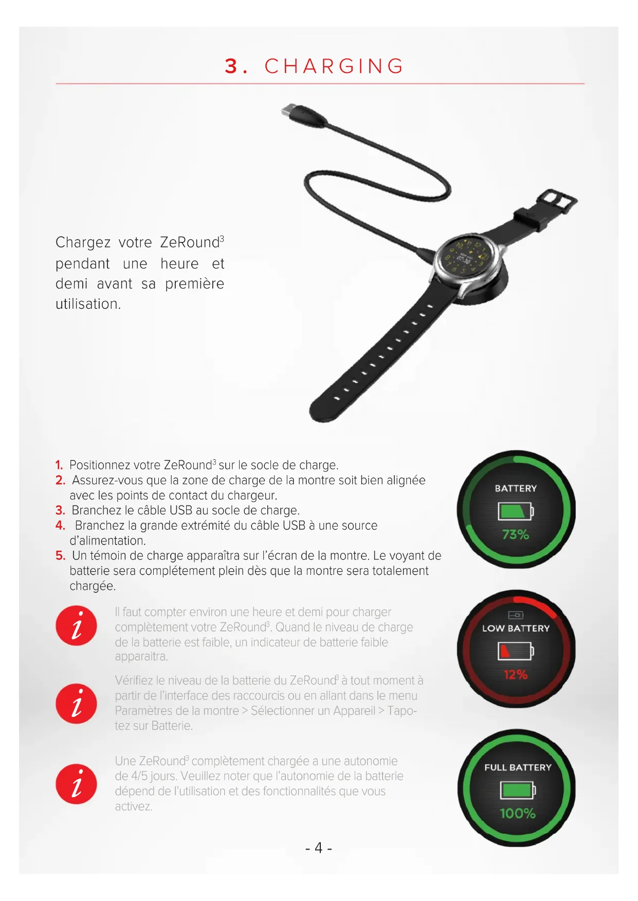 1 Un mauvais branchement du câble de chargement peut causer de graves dommages à l'appareil. Les dommages causés par une mauvaise utilisation ne sont pas couverts par la garantie. Débranchez le câble après une charge complète de ZeRound 3. - ZeRound 3 et son socle de charge contiennent des aimants puissants qui peuvent interférer avec les stimulateurs cardiaques, cartes de crédit, les montres et autres objets magnétiques sensibles. Si vous utilisez un stimulateur cardiaque ou tout autre appareil médical, veuillez consulter votre médecin avant de porter ou de manipuler ZeRound 3. Ce produit n'est pas un dispositif medico/ et ne doit pas être utilisé pour diagnostiquer ou traiter une condition médicale. Ce produit est conforme à la classe de protection IP67. IP67 indique que le produit résiste à la pénétration de poussière et à l'immersion dans l'eau à une profondeur de plus d'un mètre. ZeRound³ ne doit pas être utilisée pour la plongée sous-marine et le ski nautique. Il est déconseillé d'exposer votre ZeRound³ à du savon, des parfums, des détergents, des lotions, de la crème solaire et à des courants rapides. Veuillez noter que tous les braceletseurs ne sont pas adaptés pour être en contact avec l'eau. Par exemple, les braceletseurs en cuir.