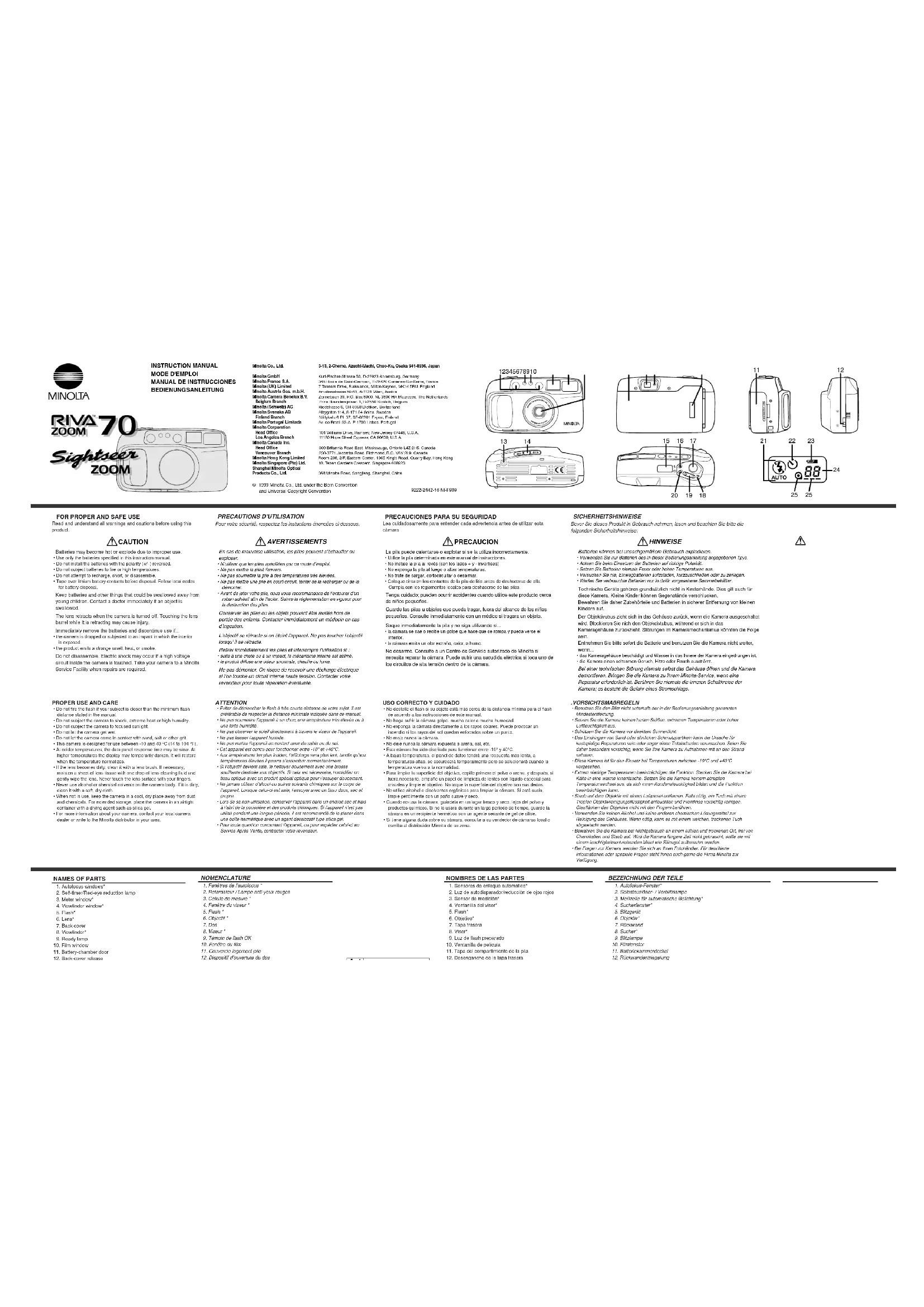 Pour votre sécurité, respectez les instuctions énoncées ci-dessous.1. Fenêtres de l’autofocus * 2. Retardateur / Lampe anti-yeux rouges 3. Cellule de mesure *4. Fenêtre du viseur * 5. Flash * 6. Objectif * 7. Dos 8. Viseur * 9. Témoin de flash OK 10. Fenêtre du film 11. Couvercle logement pile 12. Dispositif d’ouvertute du dos NOMENCLATURE 1. Sensores de enfoque automático*2. Luz de autodisparador/reducción de ojos rojos3. Sensor de medición*4. Ventanilla del visor*5. Flash*6. Objetivo*7. Tapa trasera8. Visor*9. Luz de flash preparado10. Ventanilla de película11. Tapa del compartimiento de la pila12. Desenganche de la tapa trasera