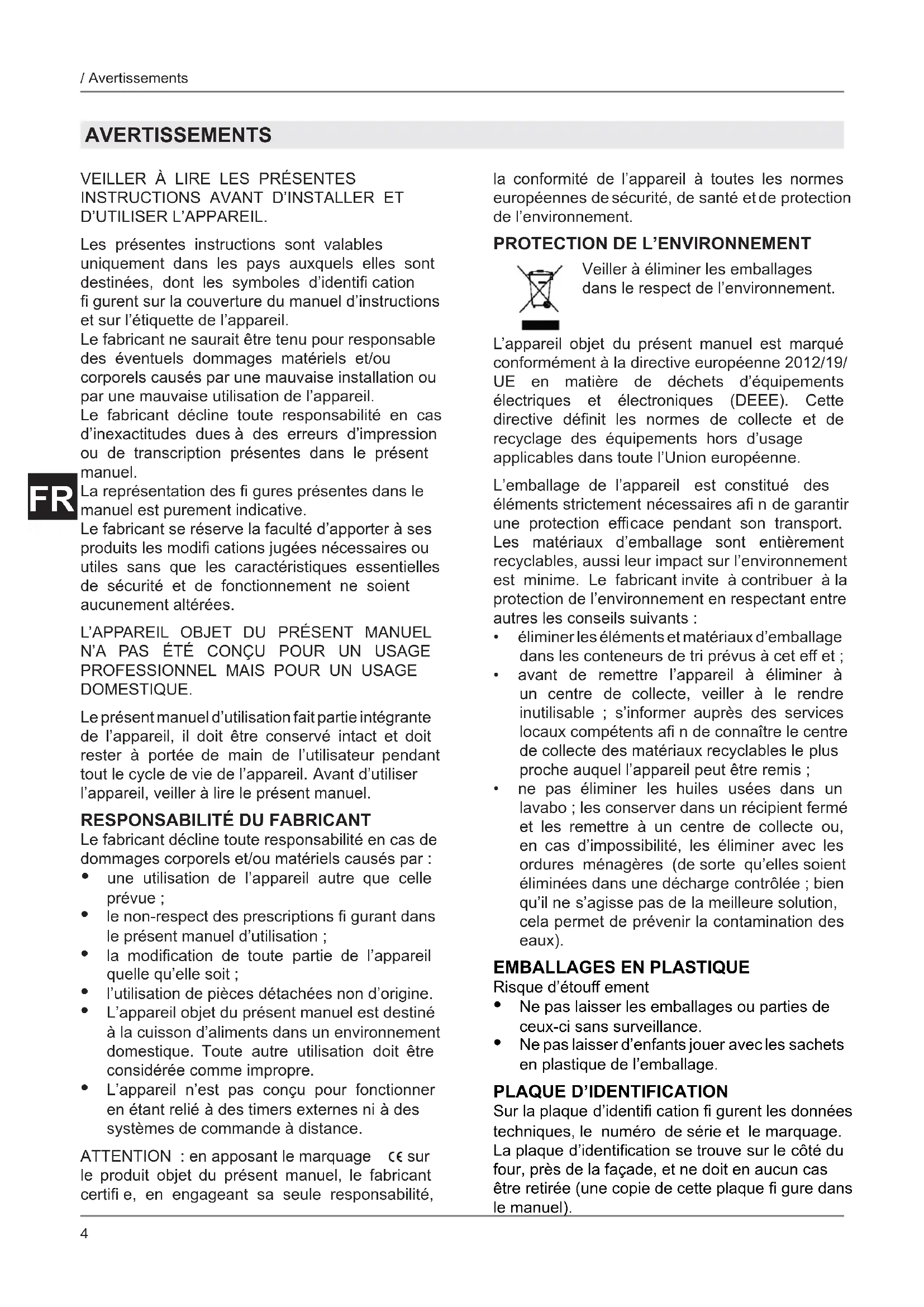 - L’appareil objet du présent manuel est destiné à la cuisson d’aliments dans un environnement domestique. Toute autre utilisation doit être considérée comme impropre.