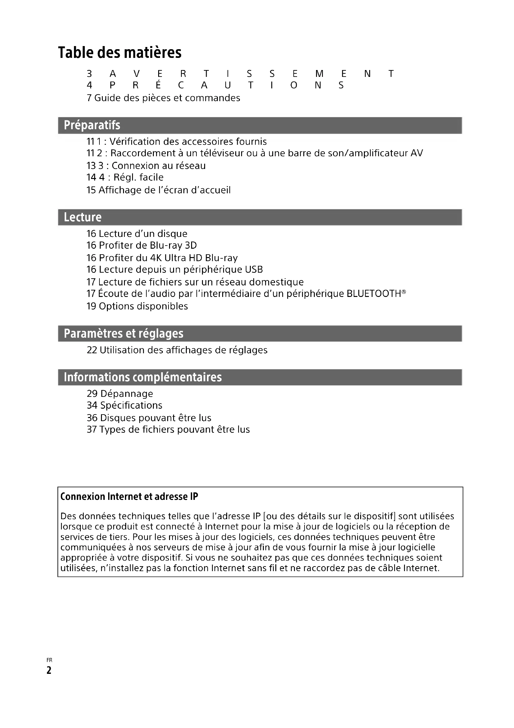 Table des matières 3AVERTISSEMENT 4PRÉCAUTIONS 7 Guide des pièces et commandes Préparatifs 11 1 : Vérification des accessoires fournis 11 2 : Raccordement à un téléviseur ou à une barre de son/amplificateur AV 13 3 : Connexion au réseau 14 4 : Régl. facile 15 Affichage de l’écran d’accueil Lecture 16 Lecture d’un disque 16 Profiter de Blu-ray 3D 16 Profiter du 4K Ultra HD Blu-ray 16 Lecture depuis un périphérique USB 17 Lecture de fichiers sur un réseau domestique 17 Écoute de l’audio par l’intermédiaire d’un périphérique BLUETOOTH® 19 Options disponibles Paramètres et réglages 22 Utilisation des affichages de réglages Informations complémentaires 29 Dépannage 34 Spécifications 36 Disques pouvant être lus 37 Types de fichiers pouvant être lus Connexion Internet et adresse IP Des données techniques telles que l’adresse IP [ou des détails sur le dispositif] sont utilisées lorsque ce produit est connecté à Internet pour la mise à jour de logiciels ou la réception de services de tiers. Pour les mises à jour des logiciels, ces données techniques peuvent être communiquées à nos serveurs de mise à jour afin de vous fournir la mise à jour logicielle appropriée à votre dispositif. Si vous ne souhaitez pas que ces données techniques soient utilisées, n’installez pas la fonction Internet sans fil et ne raccordez pas de câble Internet.3