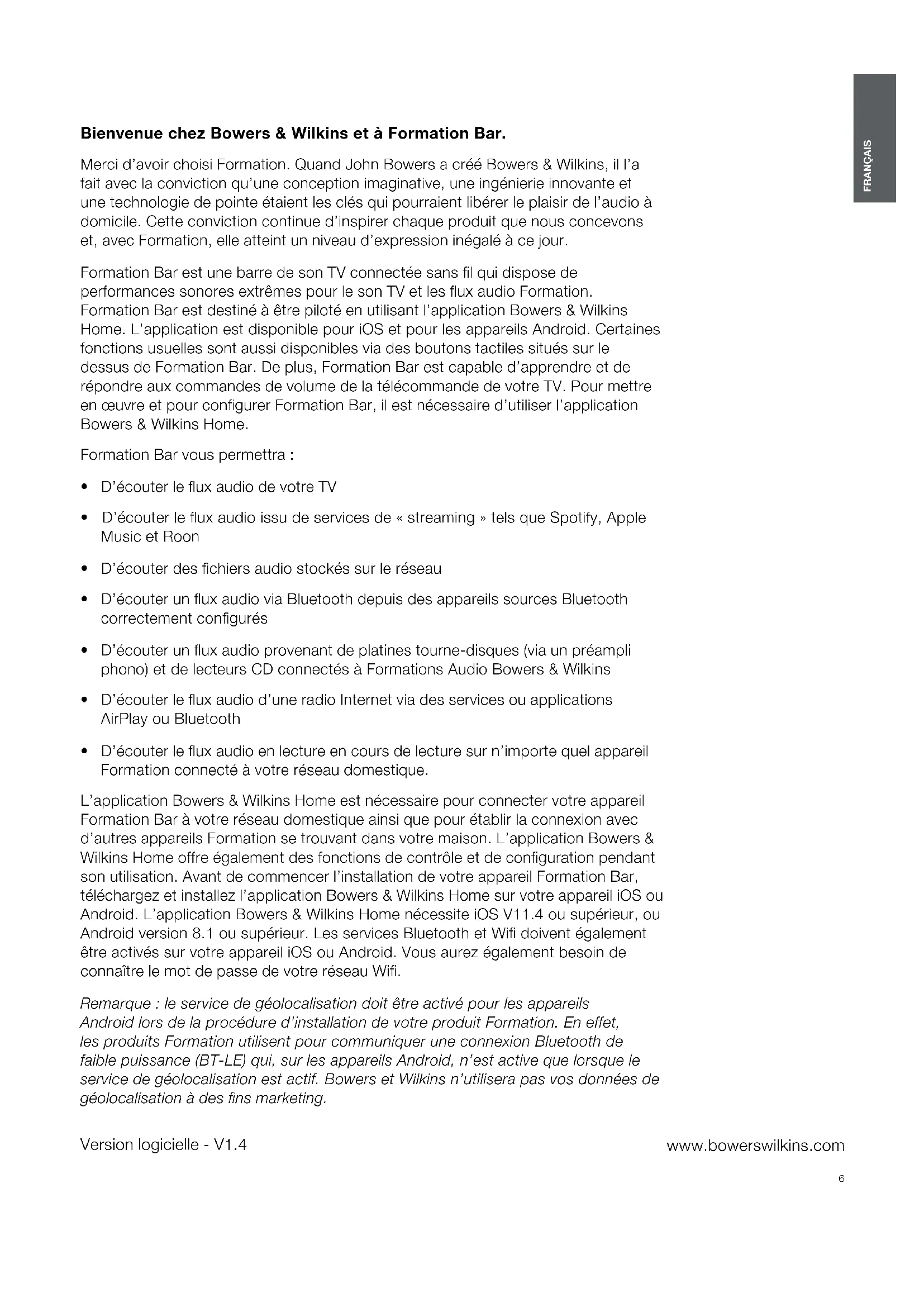 - D’écouter le ux audio en lecture en cours de lecture sur n’importe quel appareil Formation connecté à votre réseau domestique. L’application Bowers & Wilkins Home est nécessaire pour connecter votre appareil Formation Bar à votre réseau domestique ainsi que pour établir la connexion avec d’autres appareils Formation se trouvant dans votre maison. L’application Bowers & Wilkins Home offre également des fonctions de contrôle et de conguration pendant son utilisation. Avant de commencer l’installation de votre appareil Formation Bar, téléchargez et installez l’application Bowers & Wilkins Home sur votre appareil iOS ou Android. L’application Bowers & Wilkins Home nécessite iOS V11.4 ou supérieur, ou Android version 8.1 ou supérieur. Les services Bluetooth et Wi doivent également être activés sur votre appareil iOS ou Android. Vous aurez également besoin de connaître le mot de passe de votre réseau Wi. Remarque : le service de géolocalisation doit être activé pour les appareils Android lors de la procédure d’installation de votre produit Formation. En effet, les produits Formation utilisent pour communiquer une connexion Bluetooth de faible puissance (BT-LE) qui, sur les appareils Android, n’est active que lorsque le service de géolocalisation est actif. Bowers et Wilkins n’utilisera pas vos données de géolocalisation à des ns marketing. Version logicielle - V1.4 FRANÇAIS Contents FRANÇAIS 1