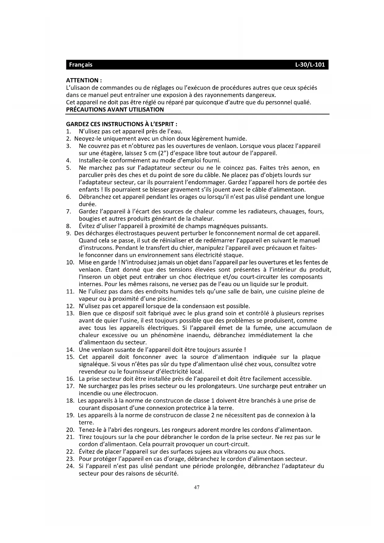 43. Ne placez jamais cet appareil sur un autre appareil électrique.