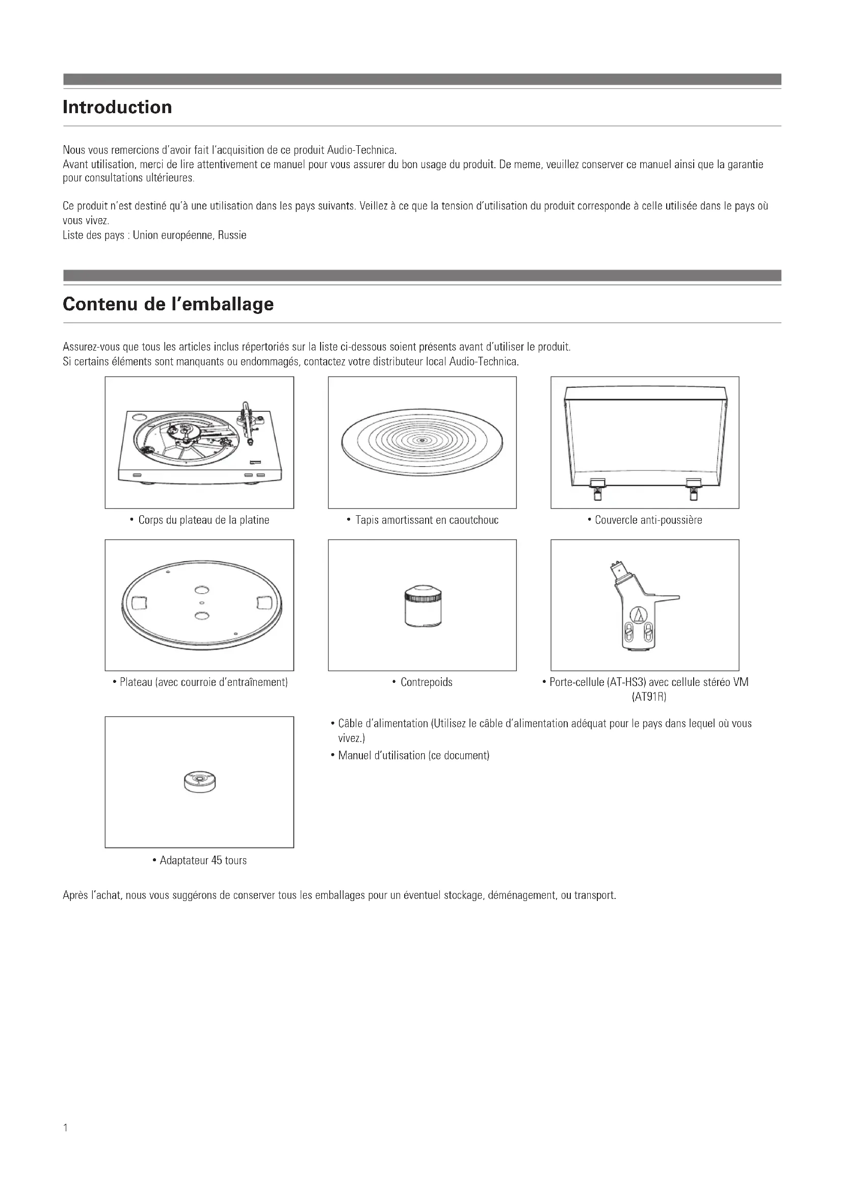 Cartridge and headshell specifications Cartridge Model AT91R Cartridge Type VM Dual Magnet Recommended load impedance 47,000 ohms Output voltage 3.5 mV (mV at 1 kHz, 5 cm/sec) Stylus 0.6 mil bonded conical Cantilever Aluminum pipe Tracking force range 1.5 to 2.5 g (standard 2.0 g) Cartridge weight 5.0 g Headshell model AT-HS3 Headshell weight 11.1 g Headshell overhang adjustment 8 mm General specifications Power supply requirements 220 to 240 V / 50, 60 Hz Power consumption 2 W Dimensions 435 mm (17.13")×353 mm (13.90")× 128 mm (5.04") (W×D×H) Weight 5.2 kg (11.46 lbs) Accessories included Rubber mat, Dust cover, Platter (with drive belt), Counterweight, Headshell (AT-HS3) with VM stereo cartridge (AT91R), 45 RPM adapter, Power cable* Replacement stylus (sold separately) ATN91R Replacement headshell (sold separately) AT-HS3 Replacement belt (sold separately) AT-LP3 exclusive belt *Use the correct power cable for the country you live in. Specifications are subject to change without notice due to improvements.1 Introduction Nous vous remercions d’avoir fait l’acquisition de ce produit Audio-Technica. Avant utilisation, merci de lire attentivement ce manuel pour vous assurer du bon usage du produit. De meme, veuillez conserver ce manuel ainsi que la garantie pour consultations ultérieures. Ce produit n’est destiné qu’à une utilisation dans les pays suivants. Veillez à ce que la tension d’utilisation du produit corresponde à celle utilisée dans le pays où vous vivez. Liste des pays : Union européenne, Russie Contenu de l’emballage Assurez-vous que tous les articles inclus répertoriés sur la liste ci-dessous soient présents avant d’utiliser le produit. Si certains éléments sont manquants ou endommagés, contactez votre distributeur local Audio-Technica.
