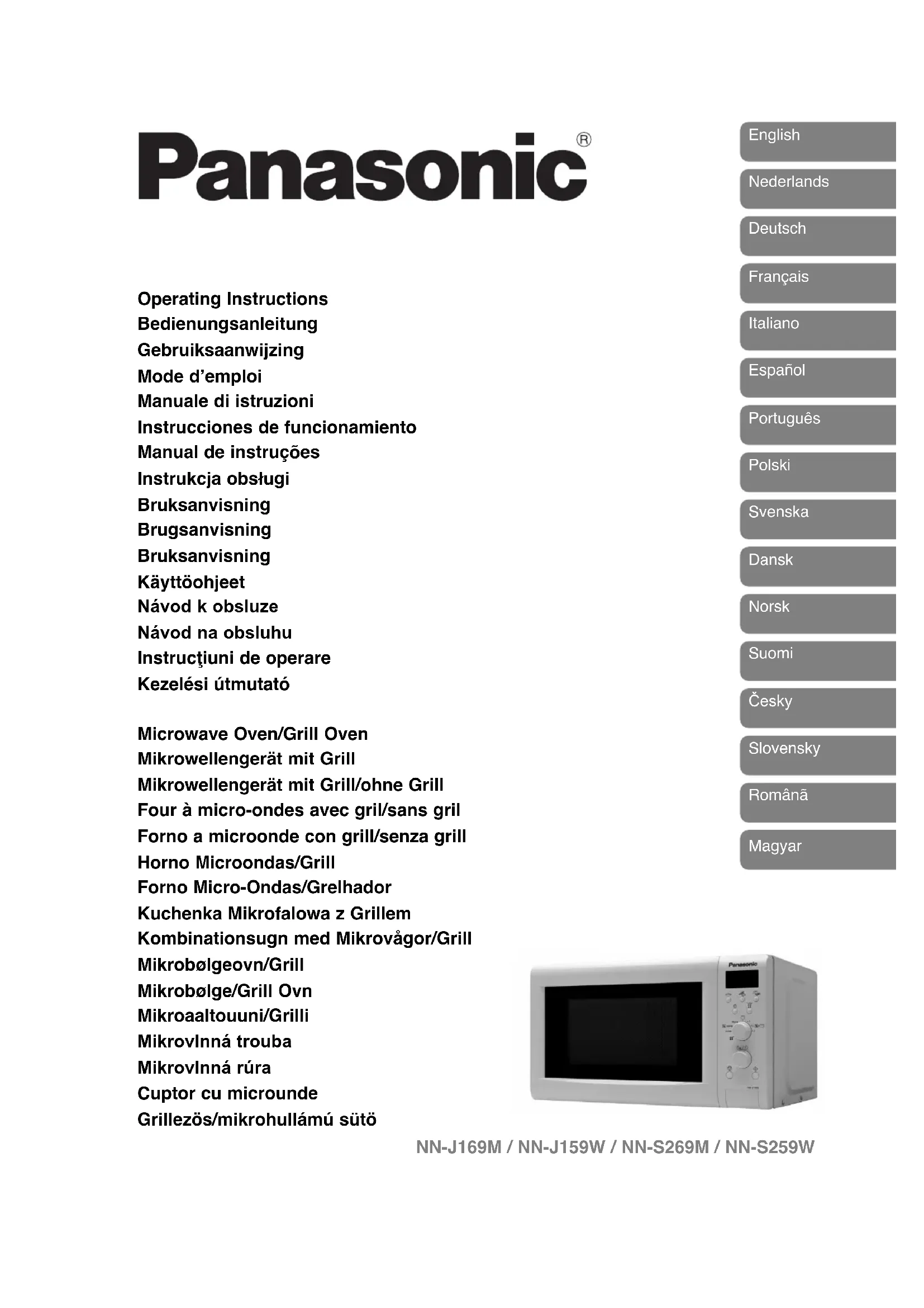Fiche technique NN-J169M / NN-J159W Alimentation 230 V, 50 Hz Puissance dʼentrée Maximale : 1100 W Micro-ondes : 1100 W Gril : 1000 W Puissance de sortie Micro-ondes; 700 W (IEC-60705) Résistance; 1000 W Dimensions extérieures 433 (L) x 327 (P) x 258 (H) mm Dimensions intérieures 292 (L) x 297 (P) x 185 (H) mm Poids (hors emballage) 12.0 Kg Bruit: 46dB NN-S269M / NN-S259W Alimentation 230 V, 50 Hz Puissance dʼentrée Micro-ondes : 1100 W Puissance de sortie Micro-ondes; 700 W (IEC-60705) Dimensions extérieures 433 (L) x 327 (P) x 258 (H) mm Dimensions intérieures 292 (L) x 297 (P) x 216 (H) mm Poids (hors emballage) 10.5 Kg Bruit: 46dB Ce produit est un matériel qui répond aux normes européennes sur les perturbations électromagnétiques EMC (EMC = compatibilité électromagnétique) EN 55011. Selon cette norme, ce produit est classé Groupe 2, classe B et reste dans les limites requises. La classification groupe 2 signifie que l'énergie à fréquence radio est intentionnellement émise sous forme d'une radiation éléctromagnétique afin de réchauffer ou de cuire des aliments. Classe B signifie que ce produit peut être utilisé dans un environnement domestique usuel.Fr-21 Tekniske specifikationer Information concernant la mise au rebut des appareils électriques et électroniques (ménages privés) Ce symbole sur les produits et/ou la documentation qui les accompagne signifie que les appareils électriques et électroniques ne doivent pas être mis au rebut avec les déchets ménagers habituels. Pour en assurer le traitement, la récupéra- tion et le recyclage appropriés, veuillez déposer ces appareils dans des centres de collecte désignés qui les accepteront gratuitement. Dʼautre part, dans certains pays, vous pourrez remettre vos produits à votre détaillant local contre lʼachat dʼun nouveau produit équivalent. La mise au rebut correcte de ce produit permettra dʼéconomiser des ressources de valeur et dʼéviter tous effets négatifs potentiels sur la santé humaine et sur lʼenvironnement qui pourraient être exercés par une mise au rebut inapproprié. Pour tous détails complémentaires concernant votre centre de collecte désigné le plus proche, veuillez vous adresser à vos autorités locales. Vous pourrez encourir une amende en cas de mise au rebut incorrecte de ces produits, et cela conformément à la législation nationale. Utilisateurs dans le commerce dans les pays de lʼUnion européenne Si vous désirez mettre au rebut des appareils électriques et électroniques, veuillez contacter votre négociant ou fournisseur qui vous fourniront un complément dʼinformation. Information sur la mise au rebut dans les pays en dehors de lʼUnion européenne Ce symbole nʼest valable que dans les seuls pays de lʼUnion européenne. Si vous désirez mettre au rebut ce produit, veuillez contacter vos autorités locales ou votre négociant et leur demander des détails sur la mise au rebut correcte. Conformément à la directive CEM 2004/108/CE, article 9, par. 2 : Centre dʼessais Panasonic Panasonic Service Europe, une division de Panasonic Marketing Europe GmbH Winsbergring 15, 22525 Hambourg, République fédérale dʼAllemagne. Fabriqué pour Panasonic Corporation par MMEAM No.18 HuanZhen West Road, BeiJiao, ShunDe, FoShan, GuangDong, République populaire de Chine.Panasonic Corporation Web Site:http://panasonic.com.net © Panasonic Corporation 2009 Printed in ChinaEnglish Nederlands Deutsch Français Italiano Español Português Polski Svenska Dansk Norsk Suomi Česky Slovensky Românã Magyar Operating Instructions Bedienungsanleitung Gebruiksaanwijzing Mode dʼemploi Manuale di istruzioni Instrucciones de funcionamiento Manual de instruções Instrukcja obsługi Bruksanvisning Brugsanvisning Bruksanvisning Käyttöohjeet Návod k obsluze Návod na obsluhu Instrucţiuni de operare Kezelési útmutató Microwave Oven/Grill Oven Mikrowellengerät mit Grill Mikrowellengerät mit Grill/ohne Grill Four à micro-ondes avec gril/sans gril Forno a microonde con grill/senza grill Horno Microondas/Grill Forno Micro-Ondas/Grelhador Kuchenka Mikrofalowa z Grillem Kombinationsugn med Mikrovågor/Grill Mikrobølgeovn/Grill Mikrobølge/Grill Ovn Mikroaaltouuni/Grilli Mikrovlnná trouba Mikrovlnná rúra Cuptor cu microunde Grillezös/mikrohullámú sütö NN-J169M / NN-J159W / NN-S269M / NN-S259WIMPORTANT SAFETY INSTRUCTIONS: Before operating this oven, please read these instructions carefully and keep for future reference. WICHTIGE SICHERHEITSANWEISUNGEN. Bitte sorgfältig durchlesen und zur weiteren Bezugnahme aufbewahren. BELANGRIJKE VEILIGHEIDSINSTRUCTIES. Lees ze a.u.b. zorgvuldig door en bewaar ze zodat u ze opnieuw kunt raadplegen wanneer nodig. INSTRUCTIONS DE SÛRETÉ IMPORTANTES. Avant dʼutiliser le four à micro-ondes, lisez attentivement les recommandations dʼutilisation et conservez-les soigneusement. ISTRUZIONI IMPORTANTI PER LA SICUREZZA. Leggere attentamente queste note e conser- varle per riferimento futuro. INSTRUCCIONES SOBRE SEGURIDAD IMPORTANTES. Léalas detenidamente y guárdelas para futura referencia. INSTRUÇÕES DE SEGURANÇA IMPORTANTES. Leia atentamente as instruções de segu- rança e guarde-as para futuras consultas. WAŻNE INSTRUKCJE BEZPIECZEŃSTWA. Prosimy o dokładne zapoznanie się z instrukcją i zachowanie jej. VIGTIGE SIKKERHEDSFORSKRIFTER. Læses omhyggeligt, og opbevares til senere brug. VIKTIGE SIKKERHETSINSTRUKSJONER. Les nøye, og oppbevar på et trygt sted slik at du kan slå opp ved behov. TÄRKEITÄ TURVALLISUUSTIETOJA. Lue nämä ohjeet huolellisesti ja säilytä ne myöhempää tarvetta varten. VIKTIGA SÄKERHETSANVISNINGAR. Läs igenom anvisningarna noga och spara dem för framtida referens. DŮLEŽITÉ BEZPEČNOSTNÍ POKYNY. Před uvedením trouby do provozu si laskavě pečlivě přečtěte tyto pokyny a uschovejte je pro budoucí použití. DÔLEŽITÉ BEZPEČNOSTNÉ UPOZORNENIE. Pred uvedením tejto mikrovlnnej rúry
