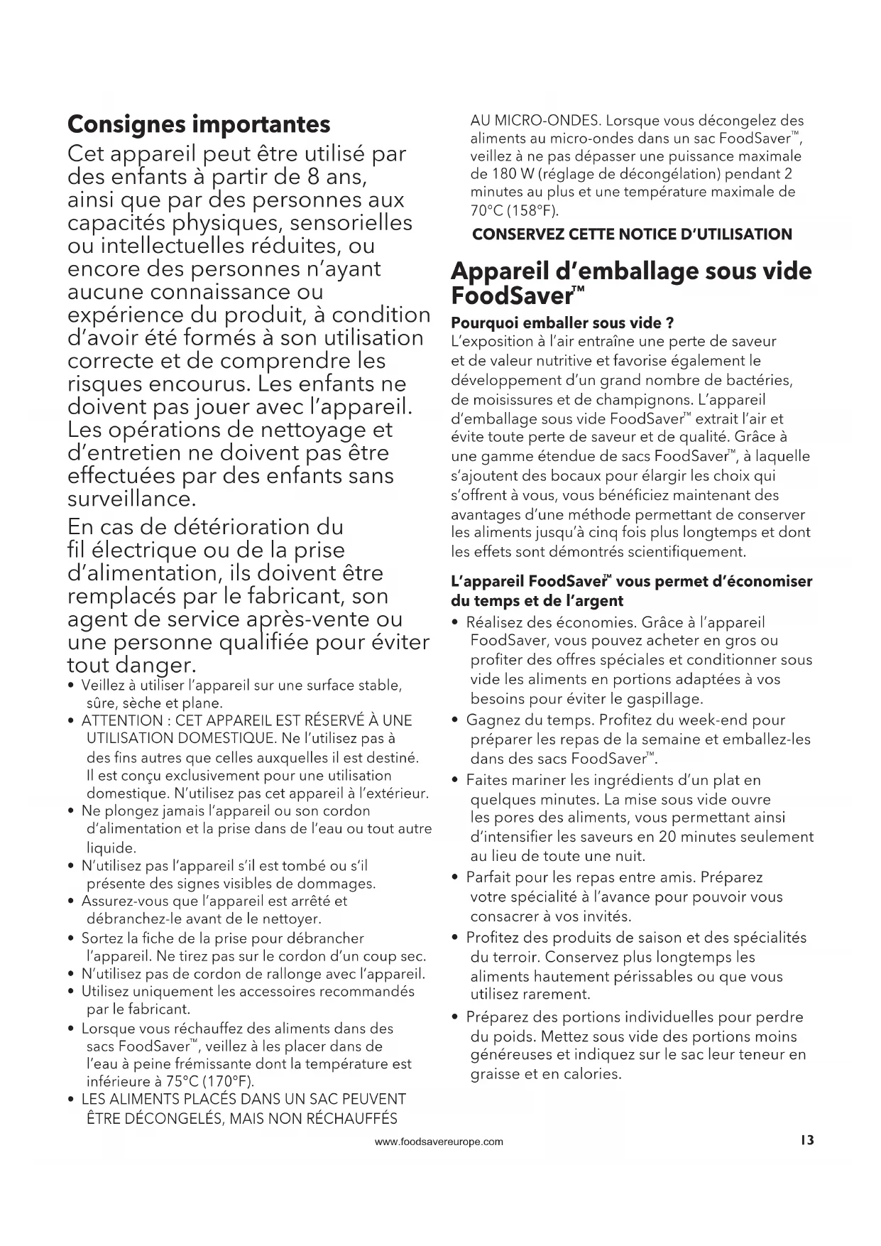continue à fonctionner correctement, nous vous recommandons de remplacer chaque année les joints d’étanchéité. Pour commander des joints de rechange, rendez-vous sur www.foodsavereurope.com. Rangement Fermez le couvercle jusqu’à ce que les loquets s’engagent, mais sans saillir et révéler la bande verte (jusqu’au premier clic). C’est assez pour retenir le couvercle, mais cela évite de comprimer les joints (ce qui pourrait entraîner un mauvais fonctionnement de l’unité). Enroulez le câble autour des taquets sous l’unité. L’unité peut être rangée en position verticale comme dans l’illustration. Guide de rangement et conseils Mise sous vide et sécurité alimentaire Le processus de mise sous vide prolonge la durée de vie des aliments en extrayant la majorité de l'air du contenant fermé hermétiquement. Il se produit ainsi une réduction de l'oxydation qui affecte la valeur nutritive, la saveur et la qualité globale des aliments. L'extraction de l'air permet également de freiner le développement des micro-organismes, qui donnent parfois naissance à des problèmes dans certaines conditions: Pour maintenir la fraîcheur des aliments en toute sécurité, il est impératif de les conserver à basse température. Vous réduisez sensiblement la croissance des micro- organismes à une température de 4°C ou moins. Congeler des aliments à -17°C ne tue pas les micro- organismes, mais arrête leur développement. Si vous souhaitez les conserver à long terme, congelez toujours les aliments périssables conditionnés sous vide et gardez- les au réfrigérateur lorsqu'ils sont décongelés. Il est important de noter que l'emballage sous vide NE remplace PAS la mise en conserve et qu'il ne peut pas inverser la détérioration des aliments. Il ne fait que ralentir leur évolution qualitative. Il est difficile de prédire combien de temps les aliments conserveront leur saveur, leur apparence ou leur texture optimale, car leur évolution est tributaire de la fraîcheur et de l'état des aliments le jour où ils ont été emballés sous vide. Important: l'emballage sous vide NE remplace PAS la réfrigération ou la congélation. Tout aliment périssable à conserver au réfrigérateur doit être réfrigéré ou congelé après avoir été emballé sous vide. Pour éviter les risques de maladies, ne réutilisez pas les sacs dans lesquels ont été emballés de la viande, du poisson cru ou des aliments gras. Ne réutilisez pas les sacs qui ont été passés au micro-ondes ou plongés dans de l'eau frémissante. Décongélation et réchauffage des aliments emballés sous vide Veillez à décongeler les aliments au réfrigérateur ou dans un four à micro-ondes. Ne décongelez jamais des aliments périssables à température ambiante. Les aliments placés dans un sac peuvent être décongelés, mais non réchauffés au micro-ondes. Lorsque vous décongelez des aliments au micro-ondes dans un sac FoodSaver