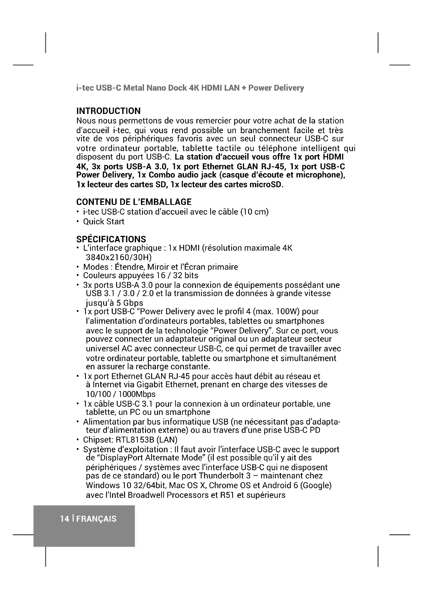 i-tec USB-C Metal Nano Dock 4K HDMI LAN + Power Delivery FRANÇAIS INTRODUCTION Nous nous permettons de vous remercier pour votre achat de la station d’accueil i-tec, qui vous rend possible un branchement facile et très vite de vos périphériques favoris avec un seul connecteur USB-C sur votre ordinateur portable, tablette tactile ou téléphone intelligent qui disposent du port USB-C. La station d’accueil vous offre 1x port HDMI 4K, 3x ports USB-A 3.0, 1x port Ethernet GLAN RJ-45, 1x port USB-C Power Delivery, 1x Combo audio jack (casque d’écoute et microphone), 1x lecteur des cartes SD, 1x lecteur des cartes microSD.