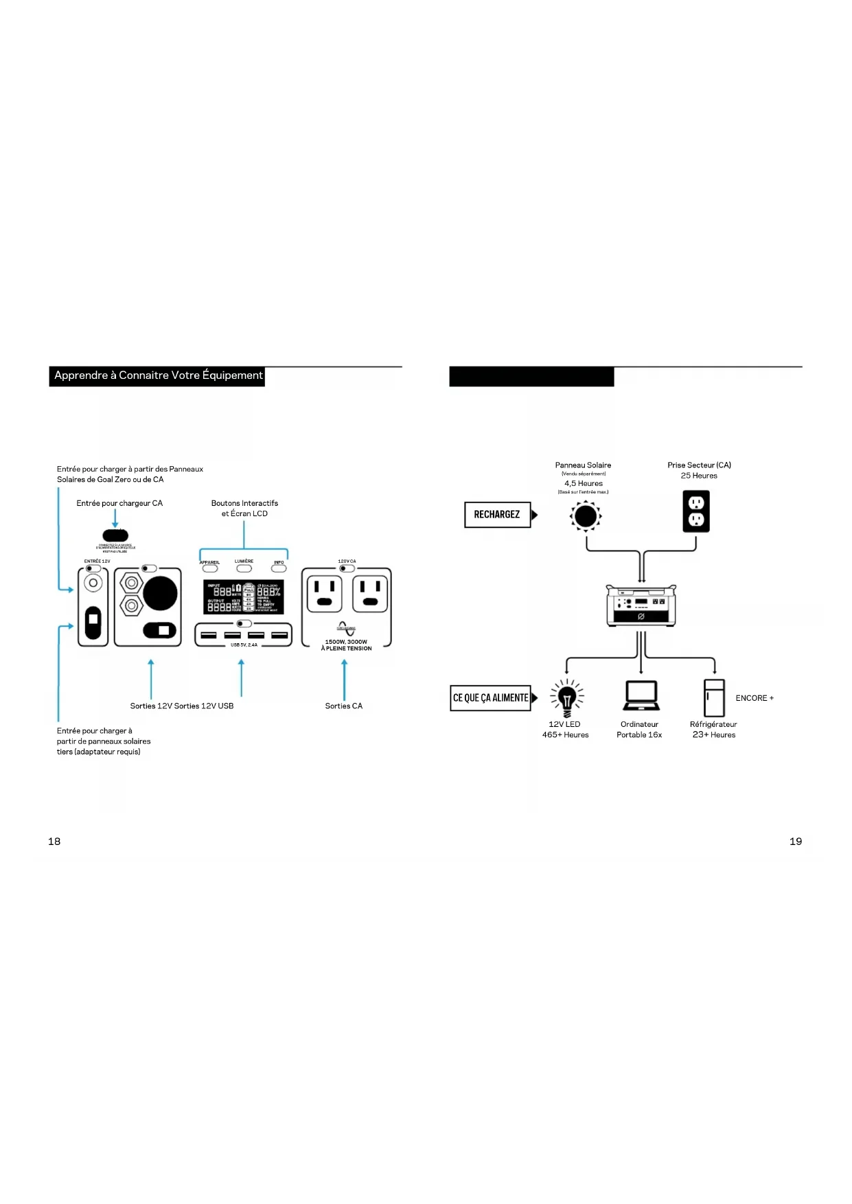Entrée pour chargeur CA Entrée pour charger à partir des Panneaux Solaires de Goal Zero ou de CA Entrée pour charger à partir de panneaux solaires tiers (adaptateur requis) Sorties 12V Sorties 12V USB Boutons Interactifs et Écran LCD Sorties CA Prise Secteur (CA) 25 Heures Panneau Solaire (Vendu séparément) 4,5 Heures (Basé sur l'entrée max.) 12V LED 465+ Heures Ordinateur Portable 16x Réfrigérateur 23+ Heures ENCORE + RECHARGEZ