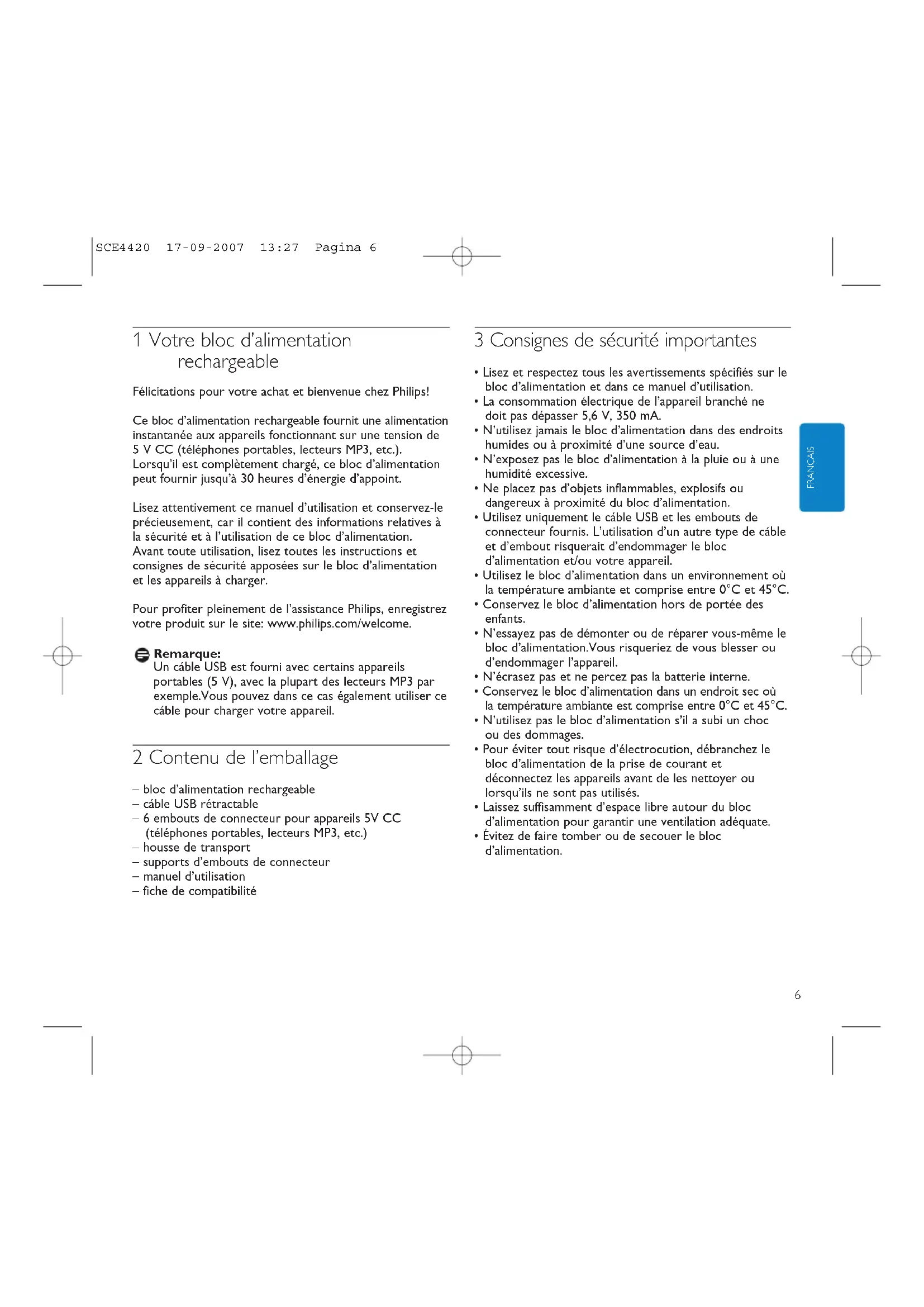 - When any problems occur with the power pack or the accessories, take the adapter and accessories to your local distributor. 9 Need help? Online help: www.philips.com/welcome For interactive help and frequently asked questions. SCE4420 17-09-2007 13:27 Pagina 56 FRANÇAIS 1 Votre bloc d’alimentation rechargeable Félicitations pour votre achat et bienvenue chez Philips! Ce bloc d’alimentation rechargeable fournit une alimentation instantanée aux appareils fonctionnant sur une tension de 5 V CC (téléphones portables, lecteurs MP3, etc.). Lorsqu’il est complètement chargé, ce bloc d’alimentation peut fournir jusqu’à 30 heures d’énergie d’appoint. Lisez attentivement ce manuel d’utilisation et conservez-le précieusement, car il contient des informations relatives à la sécurité et à l’utilisation de ce bloc d’alimentation. Avant toute utilisation, lisez toutes les instructions et consignes de sécurité apposées sur le bloc d’alimentation et les appareils à charger. Pour profiter pleinement de l’assistance Philips, enregistrez votre produit sur le site: www.philips.com/welcome. Remarque: Un cáble USB est fourni avec certains appareils portables (5 V), avec la plupart des lecteurs MP3 par exemple.Vous pouvez dans ce cas également utiliser ce cáble pour charger votre appareil. 2 Contenu de l’emballage – bloc d’alimentation rechargeable – cáble USB rétractable – 6 embouts de connecteur pour appareils 5V CC (téléphones portables, lecteurs MP3, etc.) – housse de transport – supports d’embouts de connecteur – manuel d’utilisation – fiche de compatibilité 3 Consignes de sécurité importantes