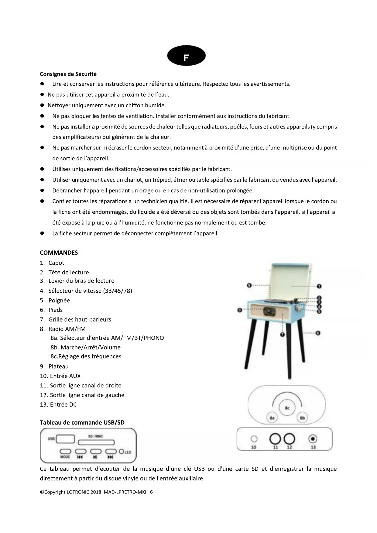 Tableau de commande USB/SD Ce tableau permet d'écouter de la musique d'une clé USB ou d'une carte SD et d'enregistrer la musique directement à partir du disque vinyle ou de l'entrée auxiliaire. F©Copyright LOTRONIC 2018 MAD-LPRETRO-MKII 7 : lire le titre précédent : Lire le titre suivant MODE: Pression courte pour basculer entre USB/SD & BT : Pression courte pour basculer entre la lecture et la pause. Maintenir appuyé pour effacer le titre en cours. En mode enregistrement, appuyez pour arrêter l'enregistrement. Commande Bluetooth: Lorsque le bras de lecture est en position de repos, la fonction Bluetooth est sélectionnée automatiquement jusqu'à ce que vous appuyiez sur la touche MODE pour changer entre USB/SD et BT. Observations