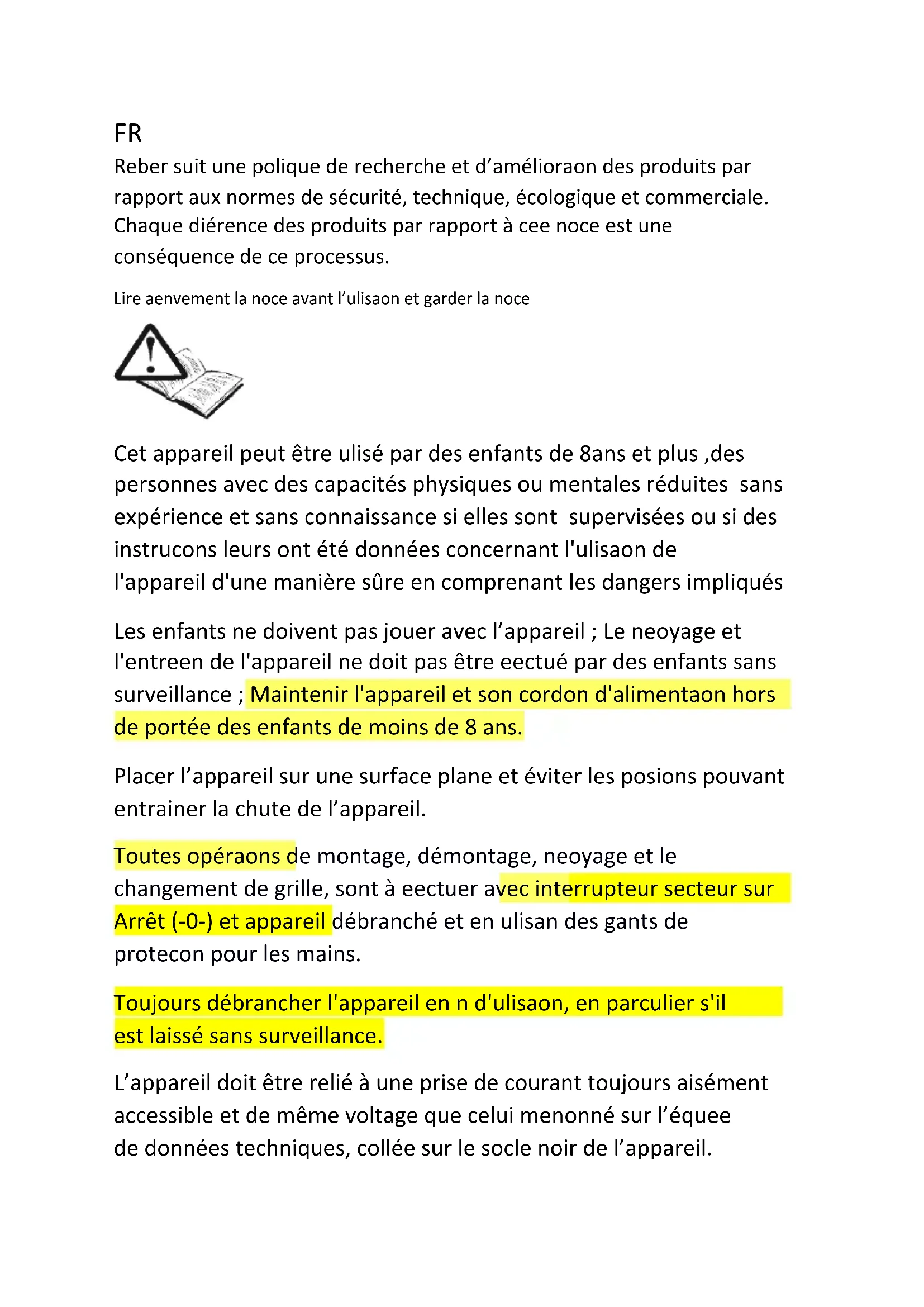 Les enfants ne doivent pas jouer avec l'appareil; Le nettoyage et l'entretien de l'appareil ne doit pas être effectué par des enfants sans surveillance; Maintenir l'appareil et son cordon d'alimentation hors de portée des enfants de moins de 8 ans.