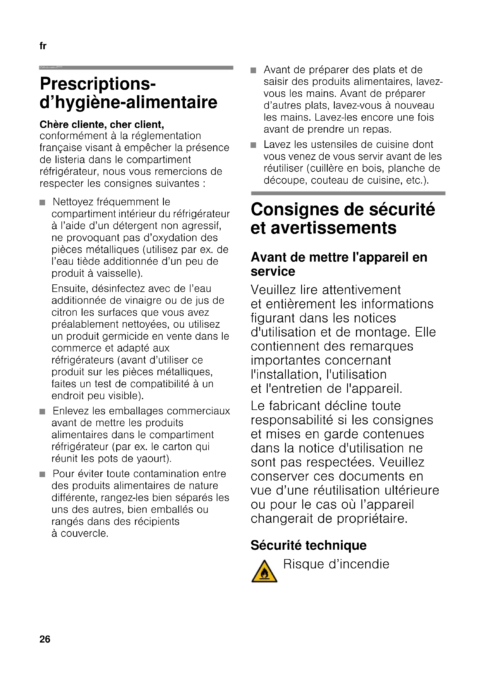 frTable des matièresfrNotice d’utilisationCombiné réfrigérateur-congélateur Prescriptions- d’hygiène-alimentaire Chère cliente, cher client, conformément à la réglementation française visant à empêcher la présence de listeria dans le compartiment réfrigérateur, nous vous remercions de respecter les consignes suivantes : ■ Nettoyez fréquemment le compartiment intérieur du réfrigérateur à l’aide d’un détergent non agressif, ne provoquant pas d’oxydation des pièces métalliques (utilisez par ex. de l’eau tiède additionnée d’un peu de produit à vaisselle). Ensuite, désinfectez avec de l’eau additionnée de vinaigre ou de jus de citron les surfaces que vous avez préalablement nettoyées, ou utilisez un produit germicide en vente dans le commerce et adapté aux réfrigérateurs (avant d’utiliser ce produit sur les pièces métalliques, faites un test de compatibilité à un endroit peu visible). ■ Enlevez les emballages commerciaux avant de mettre les produits alimentaires dans le compartiment réfrigérateur (par ex. le carton qui réunit les pots de yaourt). ■ Pour éviter toute contamination entre des produits alimentaires de nature différente, rangez-les bien séparés les uns des autres, bien emballés ou rangés dans des récipients à couvercle. ■ Avant de préparer des plats et de saisir des produits alimentaires, lavez- vous les mains. Avant de préparer d’autres plats, lavez-vous à nouveau les mains. Lavez-les encore une fois avant de prendre un repas. ■ Lavez les ustensiles de cuisine dont vous venez de vous servir avant de les réutiliser (cuillère en bois, planche de découpe, couteau de cuisine, etc.). Consignes de sécurité et avertissements Avant de mettre l'appareil en service Veuillez lire attentivement et entièrement les informations figurant dans les notices d'utilisation et de montage. Elle contiennent des remarques importantes concernant l'installation, l'utilisation et l'entretien de l'appareil. Le fabricant décline toute responsabilité si les consignes et mises en garde contenues dans la notice d'utilisation ne sont pas respectées. Veuillez conserver ces documents en vue d’une réutilisation ultérieure ou pour le cas où l’appareil changerait de propriétaire. Sécurité technique Risque d’incendiefr